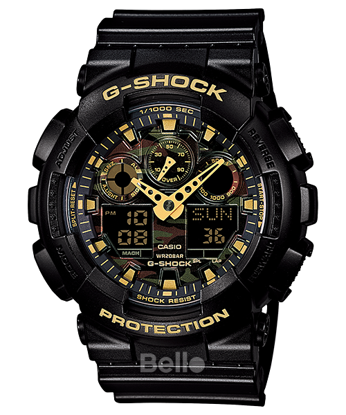 G-Shock Camouflage GA-100 thuộc dòng G-Shock thời trang vỏ lớn kích thước 55 x 51.2 x 16.9 mm. Thiết kế mặt hiển thị song song giờ kim và giờ số và được bổ sung tính năng chống từ hữu ích. Các mẫu nằm trong bộ sưu tập này được phối màu đồng nhất giữa mặt và dây và bổ sung các hoạt tiết Camouflage độc đáo đem lại phong cách thời trang quân đội rất bắt mắt và ấn tượng