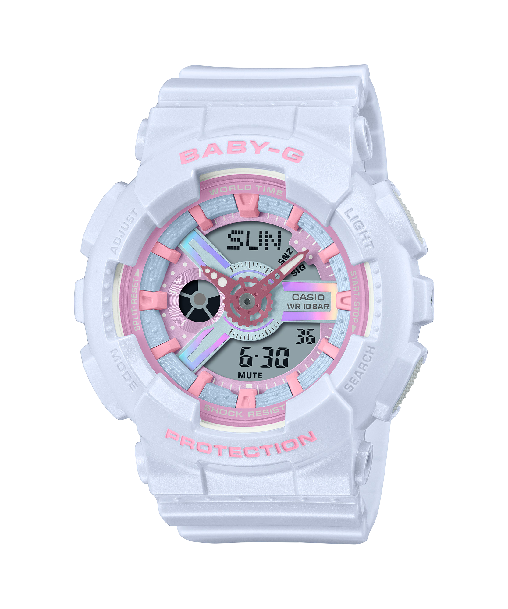 Gờ, dây đeo và vòng mặt số BA-110 lung linh với lớp hoàn thiện phân cực sáng bóng, đồng thời các chi tiết nhựa trên mặt số được sơn tông màu ngọc trai. Một tấm tạo hiệu ứng ba chiều bao bọc các thanh chữ Y ở giữa. Điều này, kết hợp với các màu sắc đa dạng thay đổi đôi chút khi đồng hồ nghiêng, giúp cấu trúc tinh tế của thiết kế trở nên lấp lánh đẹp mắt.