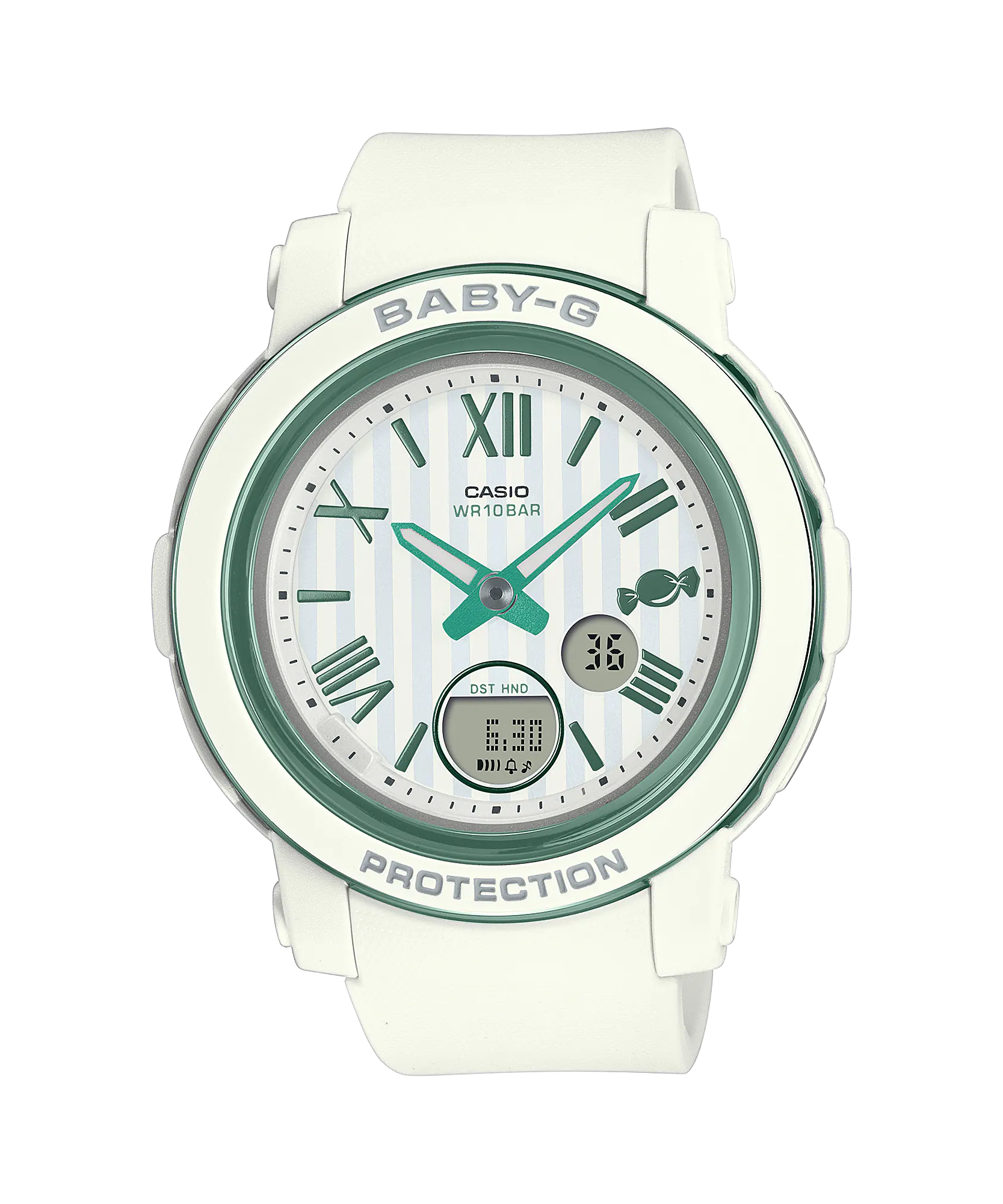 Thỏa mãn vị giác với mẫu đồng hồ BABY-G màu kẹo. Ngoài mặt số kẻ sọc, đường gờ kim loại và vạch chỉ giờ, mẫu thiết kế bọc kẹo này còn tạo thêm điểm nhấn năng động khác lạ với viên kẹo ở vị trí 3 giờ. Mẫu đồng hồ không chỉ ngọt ngào mà còn có tính thực tiễn cao với cấu trúc chống va đập và khả năng chống nước ở độ sâu 100 mét.