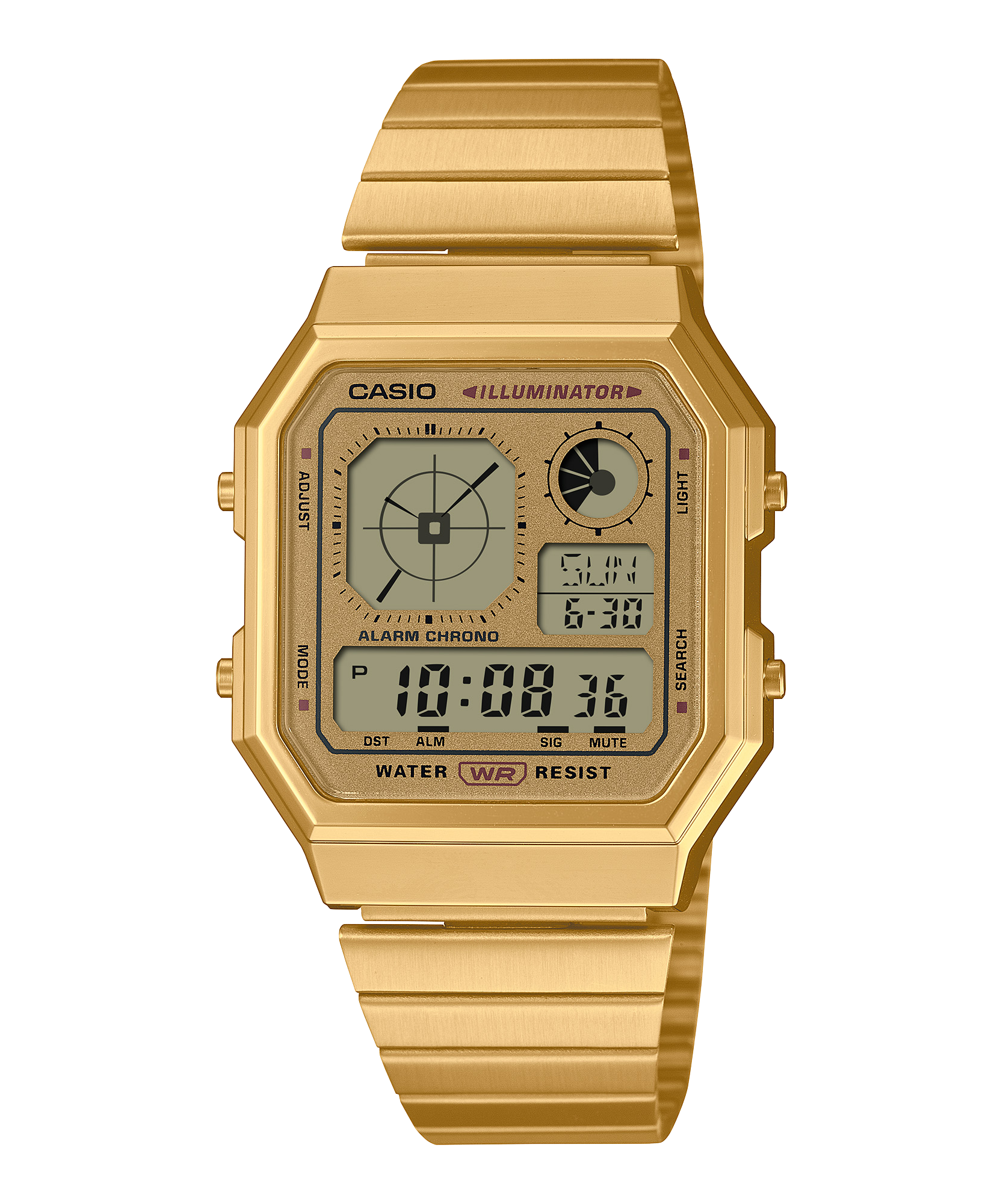 Đồng thời cũng vừa táo bạo vừa thiết thực. Được tích hợp nhiều chức năng tiện dụng như khả năng chống nước để sử dụng hàng ngày, đèn nền LED, đồng hồ bấm giờ, báo thức, v.v.