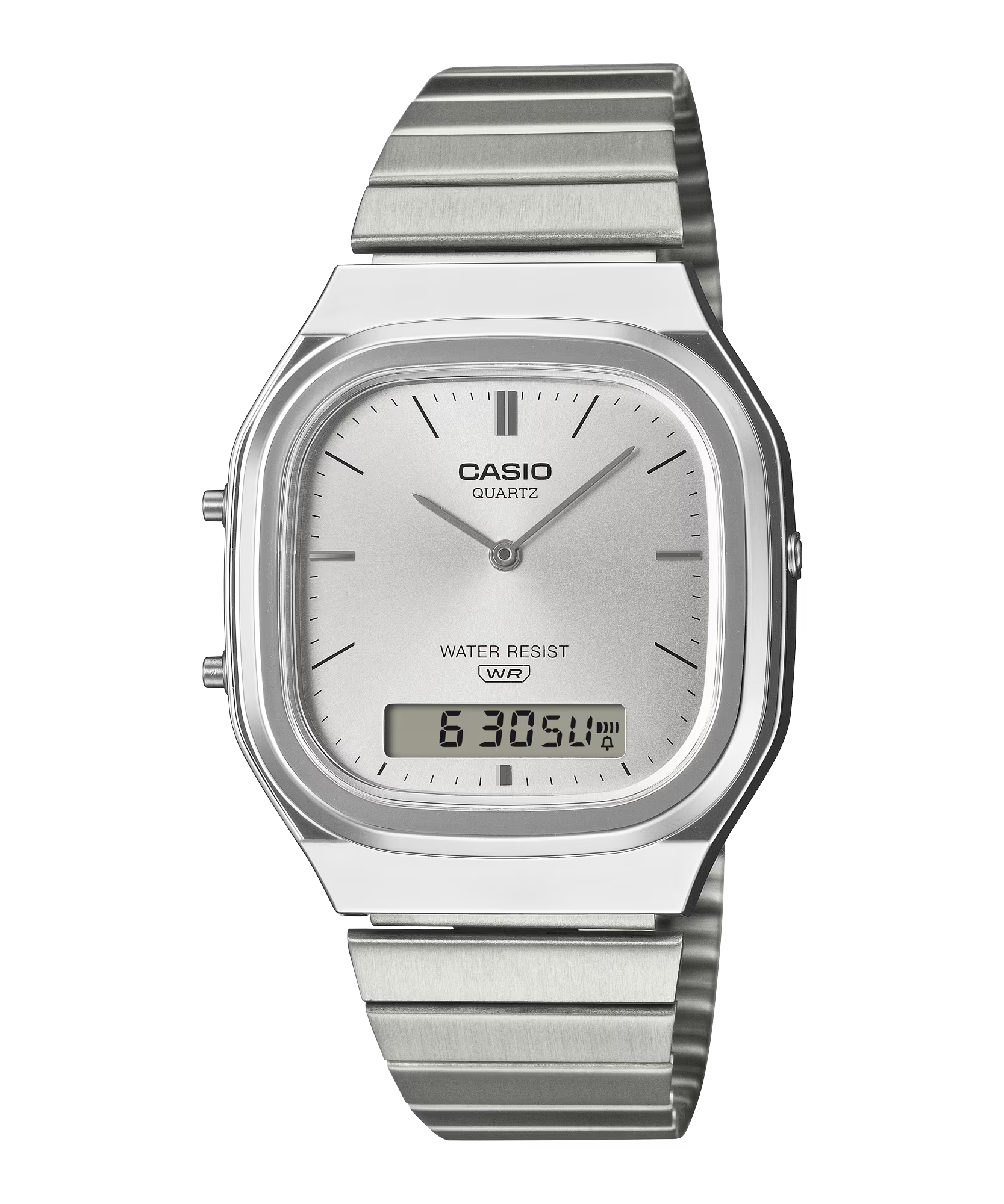 Chiếc AQ-240 kim-số với màn hình kép mang phong cách cổ điển pha lẫn hiện đại. Với mặt đồng hồ hơi vuông vức, vỏ máy bo tròn nhẹ nhàng và những đường cong kim loại mềm mại, chiếc đồng hồ này toát lên vẻ tinh tế.