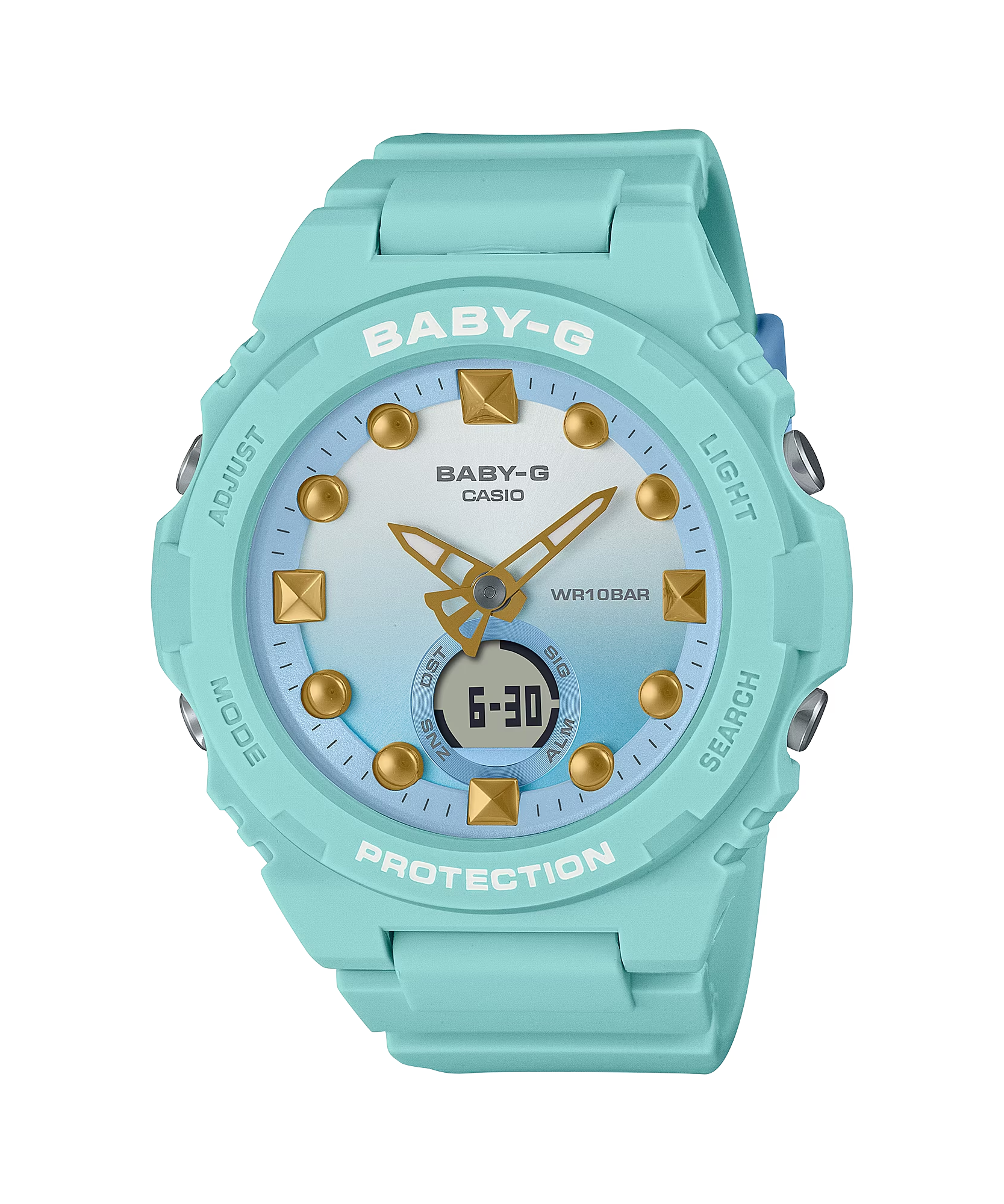 Hòa mình vào những ngày hè vui nhộn với mẫu đồng hồ BABY-G tinh nghịch, giản dị, năng động, được phối màu khéo léo giúp bạn thỏa thích đắm mình dưới ánh nắng. Các chi tiết lạ mắt và thiết kế vui tươi với tông màu xanh bạc hà như mặt nước biển trong veo chắc chắn sẽ làm tươi sáng cả ngày của bạn. Màu loang trên mặt số gợi lên khung cảnh bãi biển mùa hè đang thay đổi khi mặt trời lặn. Các vạch chỉ giờ được hoàn thiện bằng phương pháp lắng đọng hơi kim loại tỏa sáng trông như báu vật ngọc trai và vỏ sò, trong khi kim phút gợi lên hình ảnh chiếc đuôi nàng tiên cá. Mang cả bãi biển vào tủ quần áo để bạn khởi động mùa hè. Tinh nghịch nhưng vẫn thiết thực. Cấu trúc chống va đập có thể chịu được va đập và trầy xước, trong khi khả năng chống nước ở độ sâu lên đến 100 mét giúp bạn đeo thoải mái khi bơi.