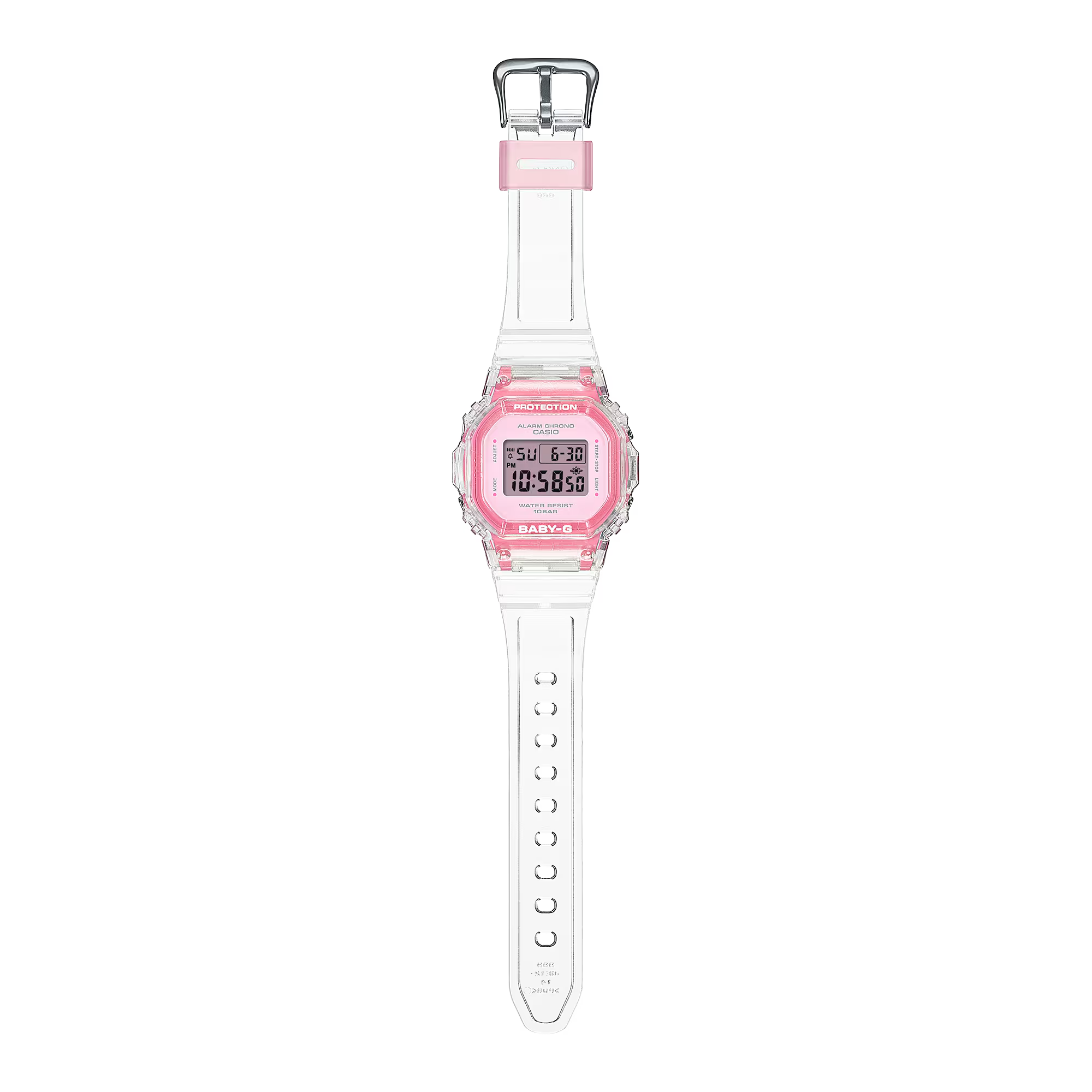 Chiếc đồng hồ BGD-565 nhỏ gọn đầy nắng này có gờ và dây đeo mang tính biểu tượng bằng nhựa trong, cho phép lớp nhựa sáng màu của vỏ trung tâm lộ rõ.