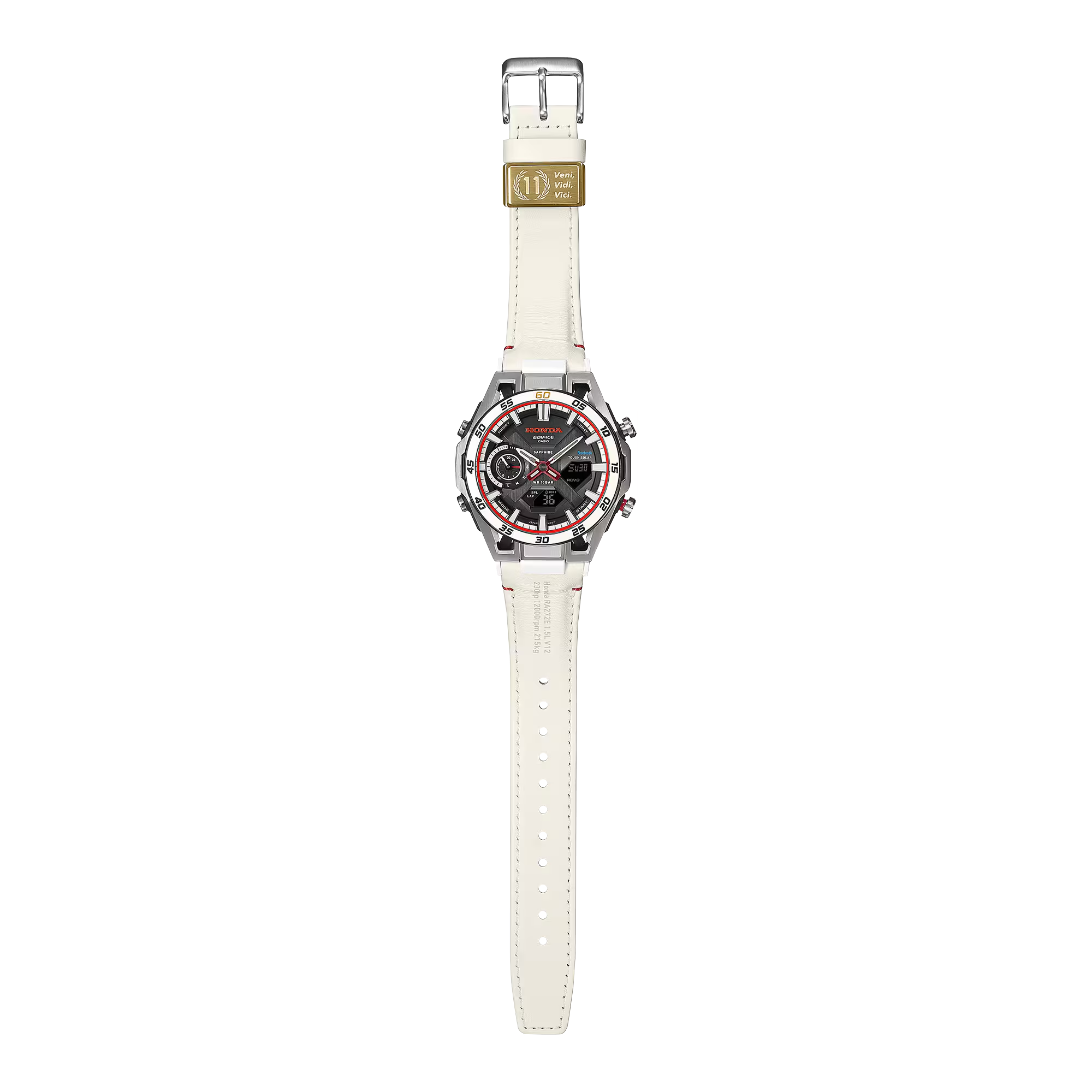 Mỗi chi tiết thiết kế đều kể một câu chuyện riêng. Vòng dây đeo mang câu nói bất hủ của đội trưởng Yoshio Nakamura: Veni, Vidi, Vici — “Tôi đã đến, tôi đã chứng kiến và tôi đã chinh phục.” Mặt dài của dây đeo khắc họa thông số kỹ thuật động cơ RA272 và bản vẽ kỹ thuật nguyên bản. Và vỏ sau tự hào trưng bày logo chính thức kỷ niệm chiến thắng này của Honda.