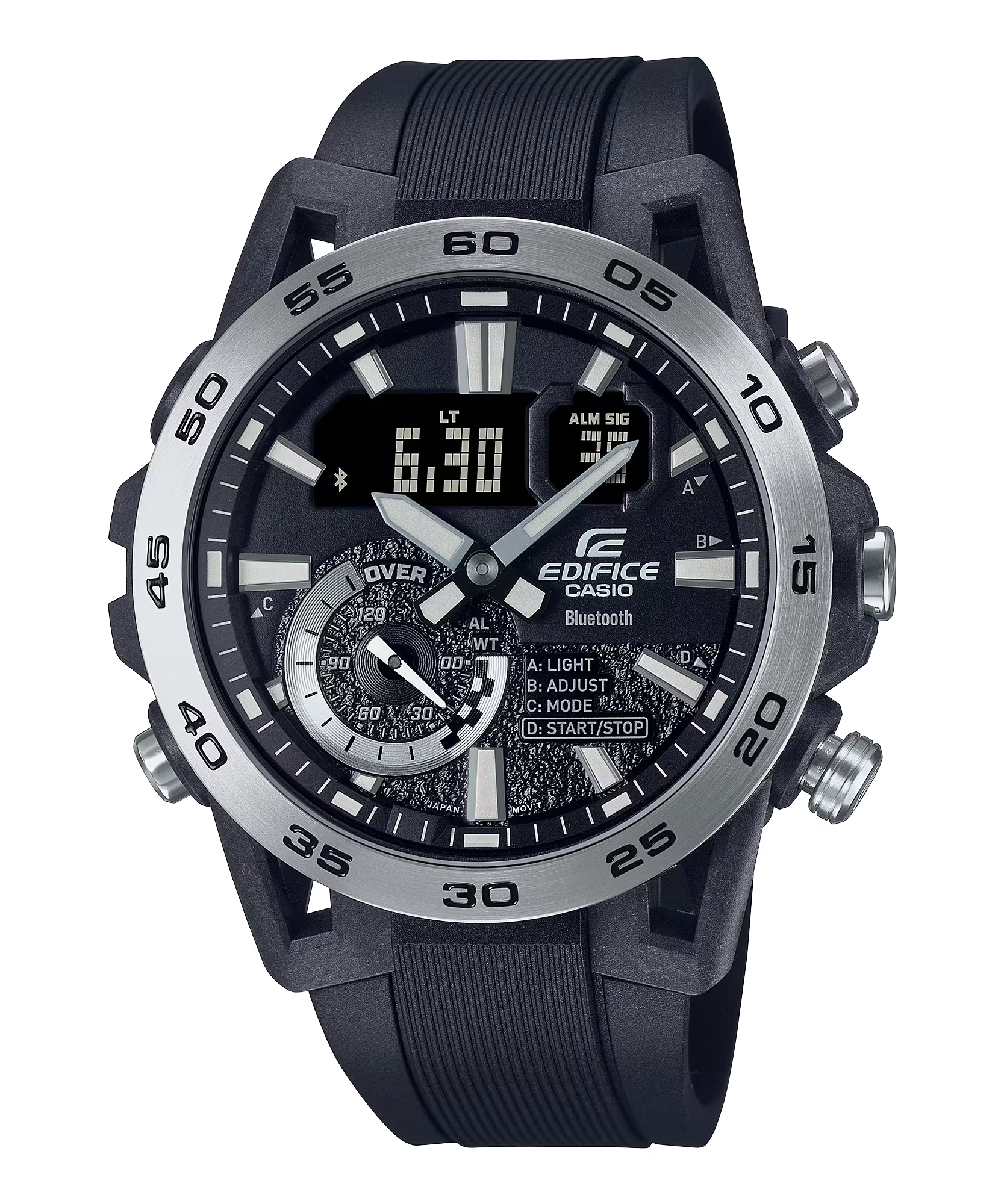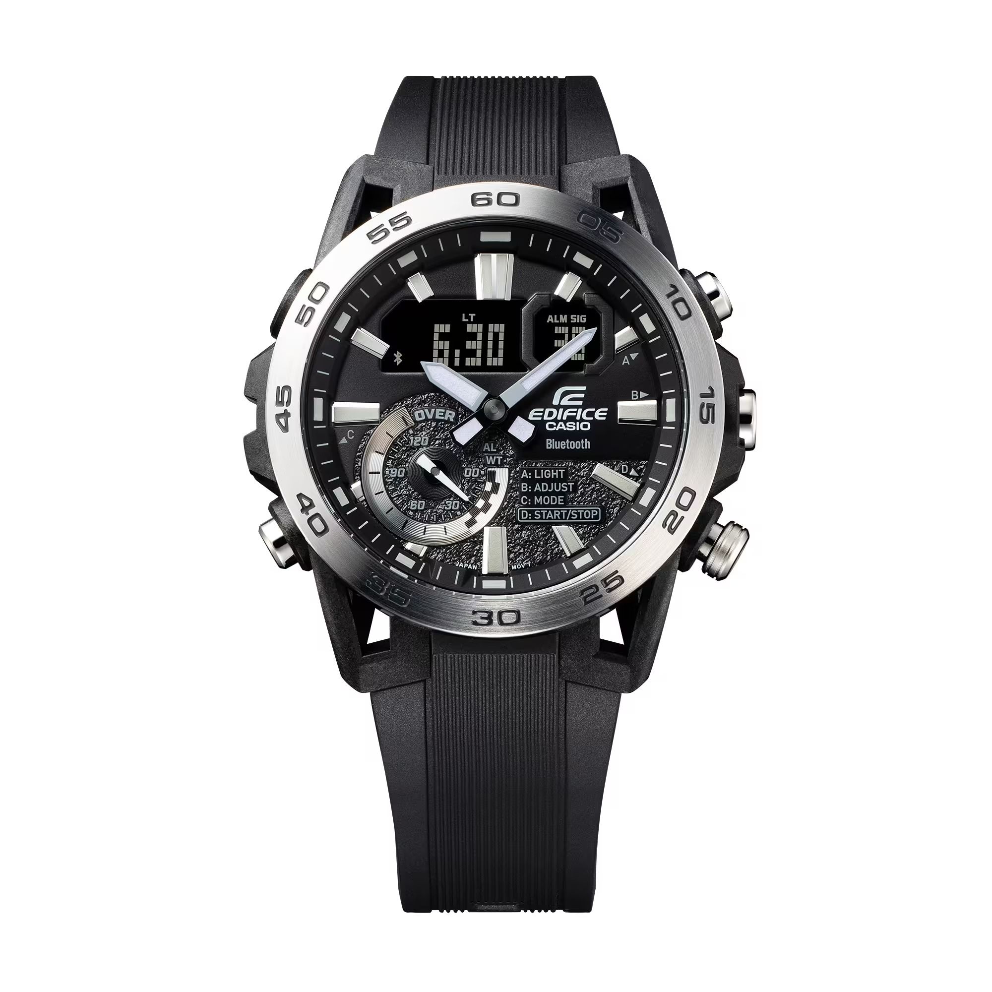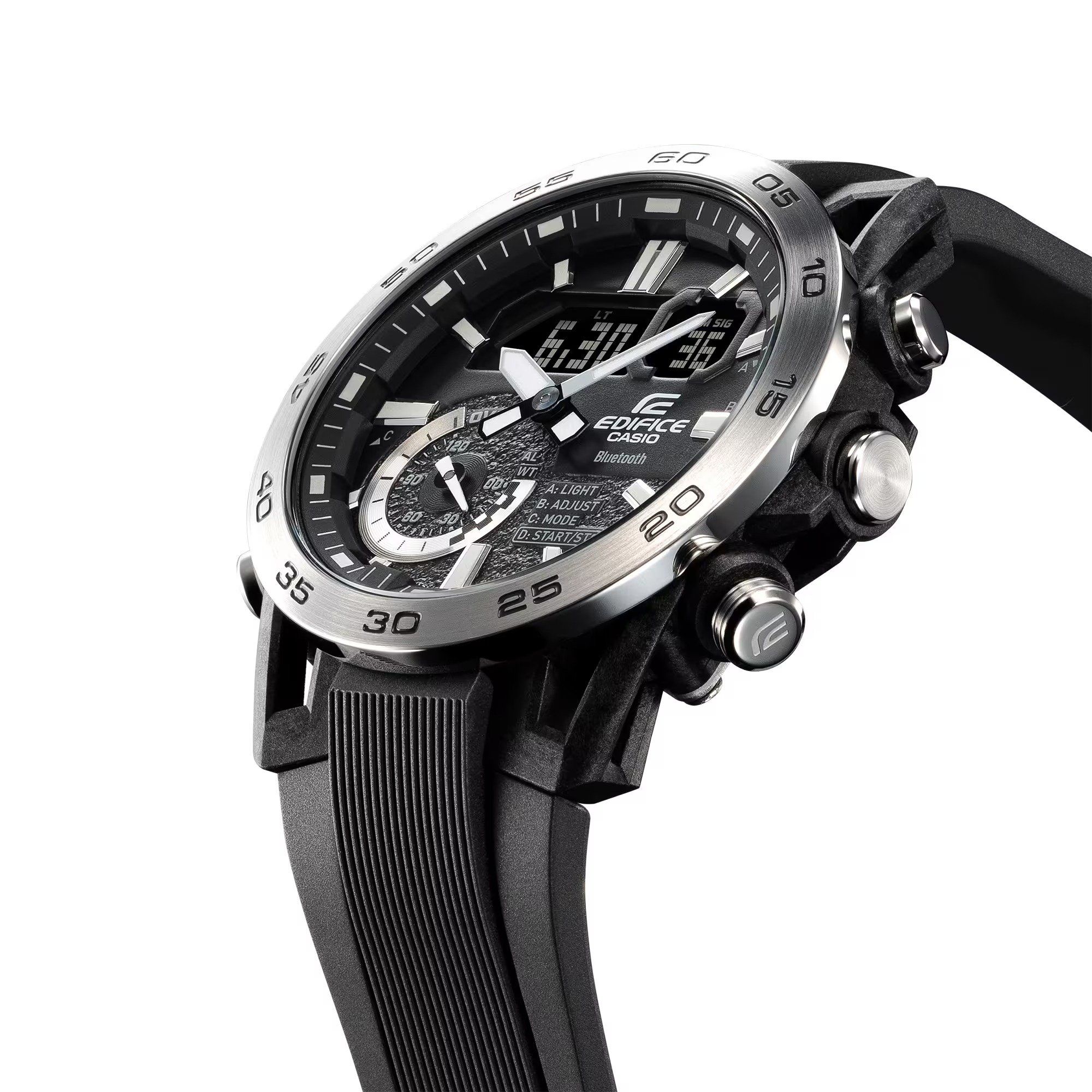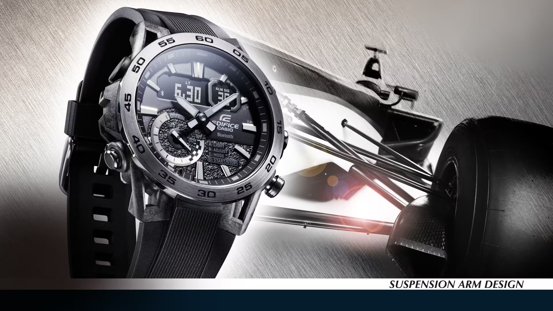 Giới thiệu mẫu đồng hồ EDIFICE SOSPENSIONE ECB-40 đua xe thể thao đích thực, có thiết kế tinh xảo và đầy đủ chức năng, với thiết kế tay giảm xóc bằng nhựa gia cố sợi carbon và tính năng Kết nối điện thoại thông minh. Thiết kế vỏ độc đáo được lấy cảm hứng từ hệ thống giảm xóc của xe đua công thức với các vấu được cấu tạo theo cách sắp xếp bốn tay: hai tay trên và hai tay dưới. Chất liệu nhựa gia cố bằng sợi carbon tạo nên chiếc vỏ nhẹ nhưng chắc chắn. Nhờ khả năng kết nối với điện thoại thông minh, chiếc đồng hồ đặc biệt này sẽ tự động kết nối với bất kỳ điện thoại thông minh nào nằm trong phạm vi ghép nối. Nhấn vào ứng dụng để truy cập các chức năng quan trọng dành cho các đội đua, bao gồm chức năng điều chỉnh giờ tự động chính xác đến từng giây, dễ dàng quản lý giờ thế giới và truyền dữ liệu đồng hồ bấm giờ đo được lên đến từng mili giây, tối đa 200 vòng chạy vào điện thoại thông minh của bạn. Đèn LED đôi chiếu sáng cực mạnh có độ sáng cao và có thể chiếu sáng màn hình kim-số, giúp bạn dễ đọc kể cả trong bóng tối.