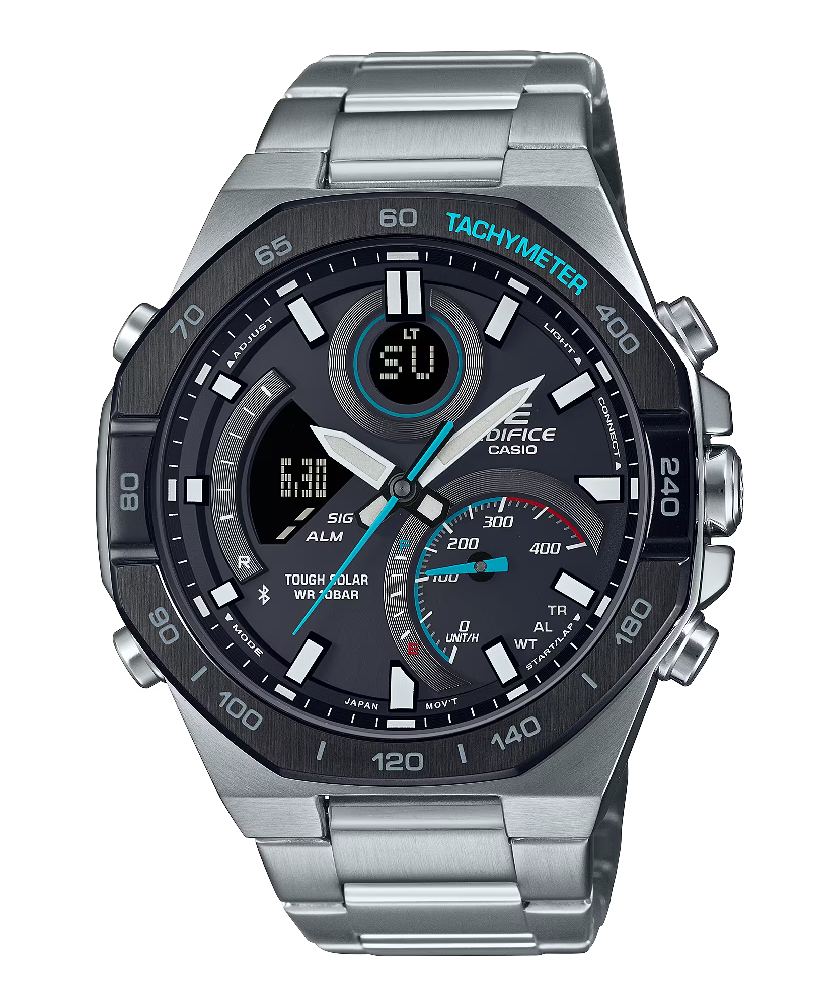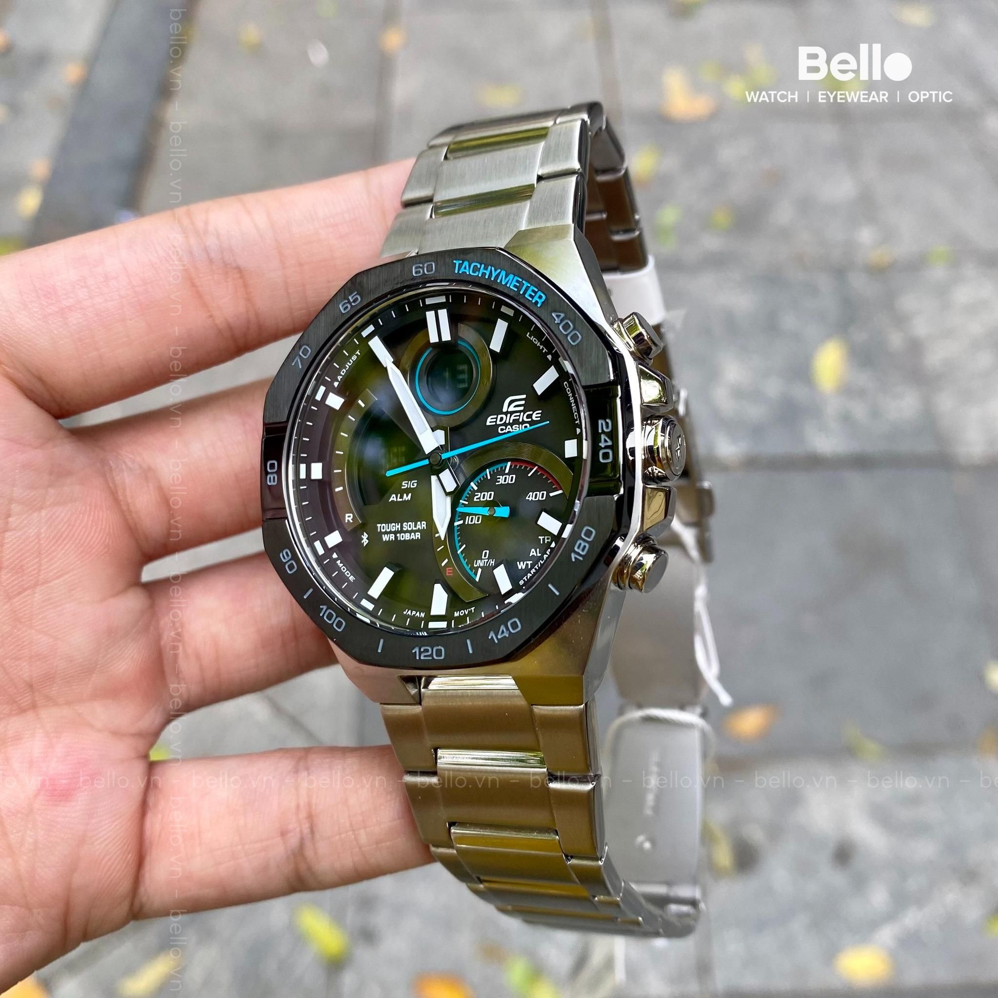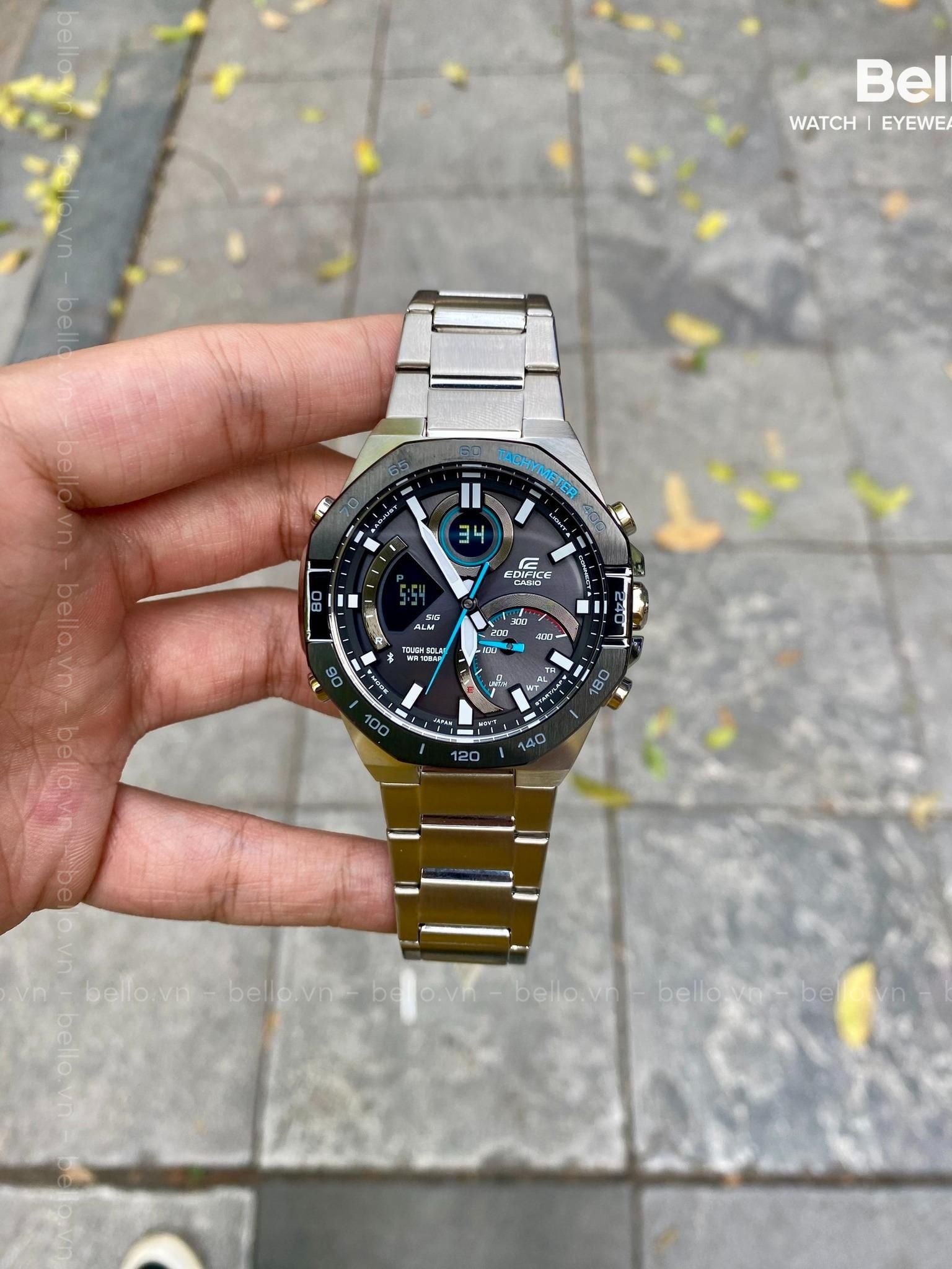 Với khả năng kết nối dễ dàng với điện thoại thông minh và nhiều tính năng khác, chiếc đồng hồ EDIFICE kết hợp kim-số này là hiện thân của tốc độ và trí tuệ. Thiết kế tinh xảo, mạnh mẽ với đường gờ bát giác gợi lên những đường nét công cụ của thợ sửa xe đua. Không chỉ bắt mắt, chiếc đồng hồ này còn cung cấp đầy đủ chức năng thực tế để bạn có đủ thông tin cần thiết trên kim đồng hồ và màn hình LCD. Đồng bộ với điện thoại thông minh của bạn qua Bluetooth® để hiển thị giờ hiện hành chính xác ở mọi nơi. Chỉ cần nhấn vào ứng dụng để dễ dàng quản lý các chức năng như chọn thành phố từ danh sách Giờ thế giới. Mặt số lồng lớn ở vị trí 4 giờ có chỉ báo tốc độ hiển thị tốc độ trung bình khi bấm giờ vòng chạy cho khoảng cách đã đặt. Đèn LED hoàn toàn tự động chiếu sáng mặt số và màn hình LCD hiển thị mỗi khi bạn nghiêng cổ tay. Công nghệ Tough Solar sạc đồng hồ bằng năng lượng mặt trời hay thậm chí ánh sàng đèn huỳnh quang.