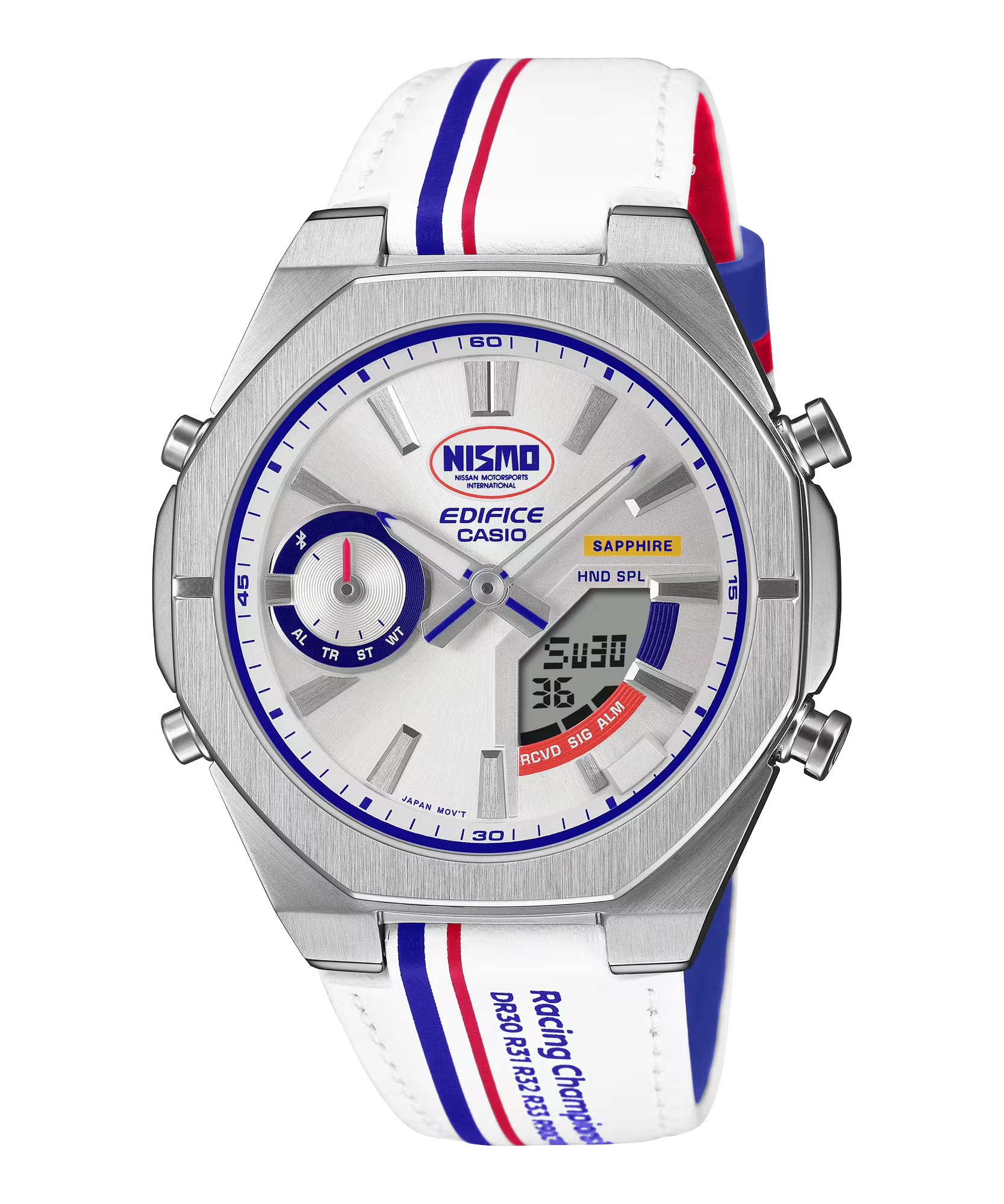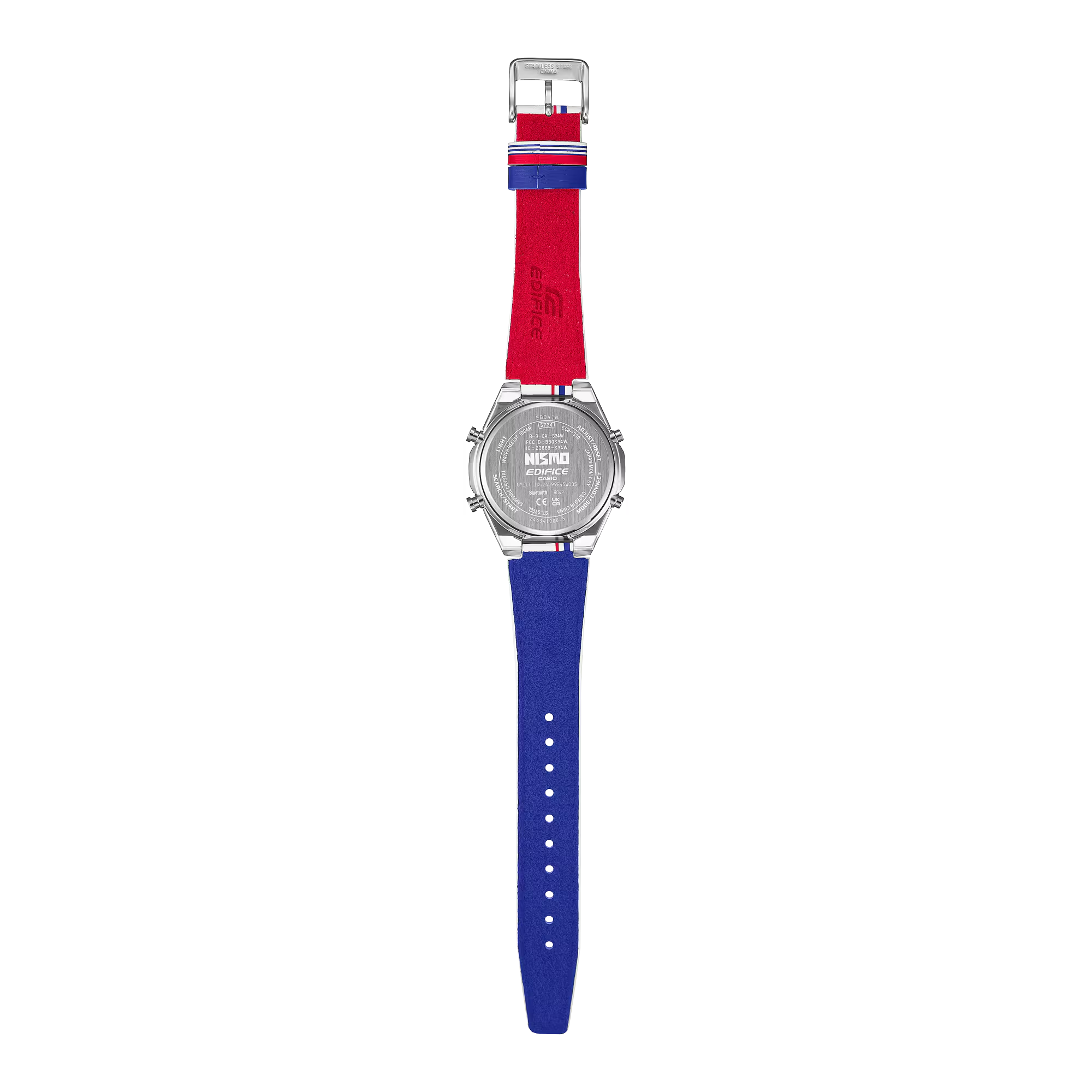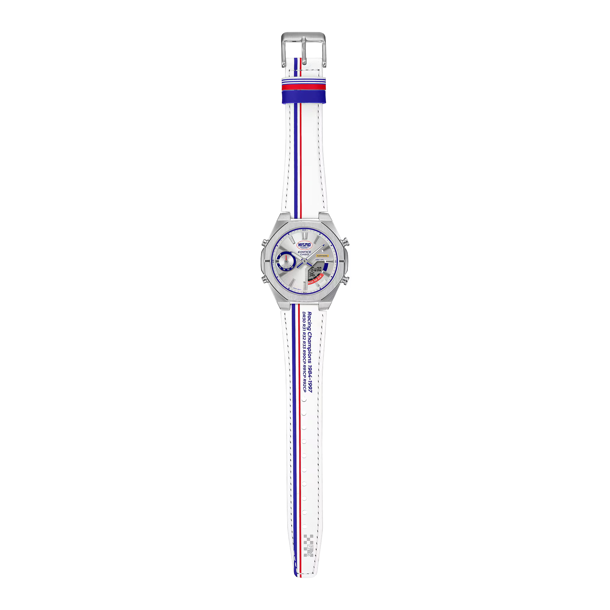 Chiếc đồng hồ sắc sảo và nổi bật này kết hợp những đặc điểm bắt mắt như logo NISMO nguyên bản cùng mặt số và dây đeo với thiết kế ba màu sống động đặc trưng của đội ngũ sản xuất. Màu xanh và đỏ của bộ ba màu được tái hiện ở mặt dưới của dây đeo, và các sọc của đồng phục NISMO nguyên bản được tái hiện trên vòng dây đeo. Dây đeo cũng được in tên các nhà vô địch NISMO từ năm 1984 đến năm 1997, nhằm tôn vinh cả những chiếc xe đua lừng danh lẫn đội đua đã đưa họ đến vinh quang.