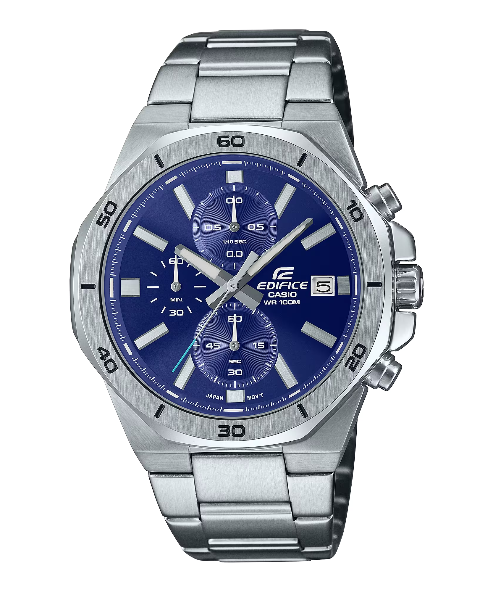 Mẫu đồng hồ EDIFICE thể thao cổ điển với thiết kế cứng cáp, mạnh mẽ cùng đường gờ bát giác tạo nên vẻ ngoài năng động, táo bạo.