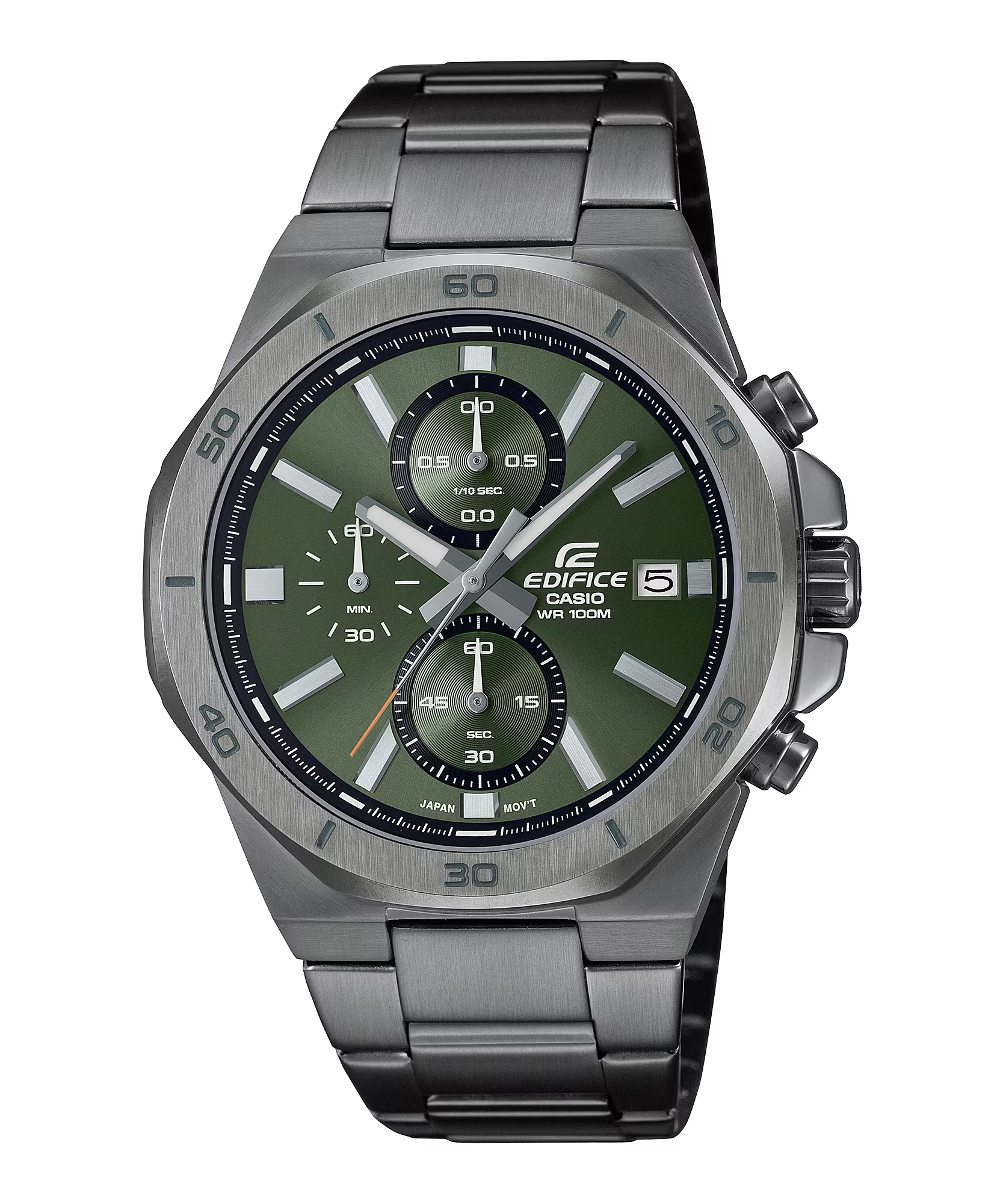 Mẫu đồng hồ EDIFICE thể thao cổ điển với thiết kế cứng cáp, mạnh mẽ cùng đường gờ bát giác tạo nên vẻ ngoài năng động, táo bạo.