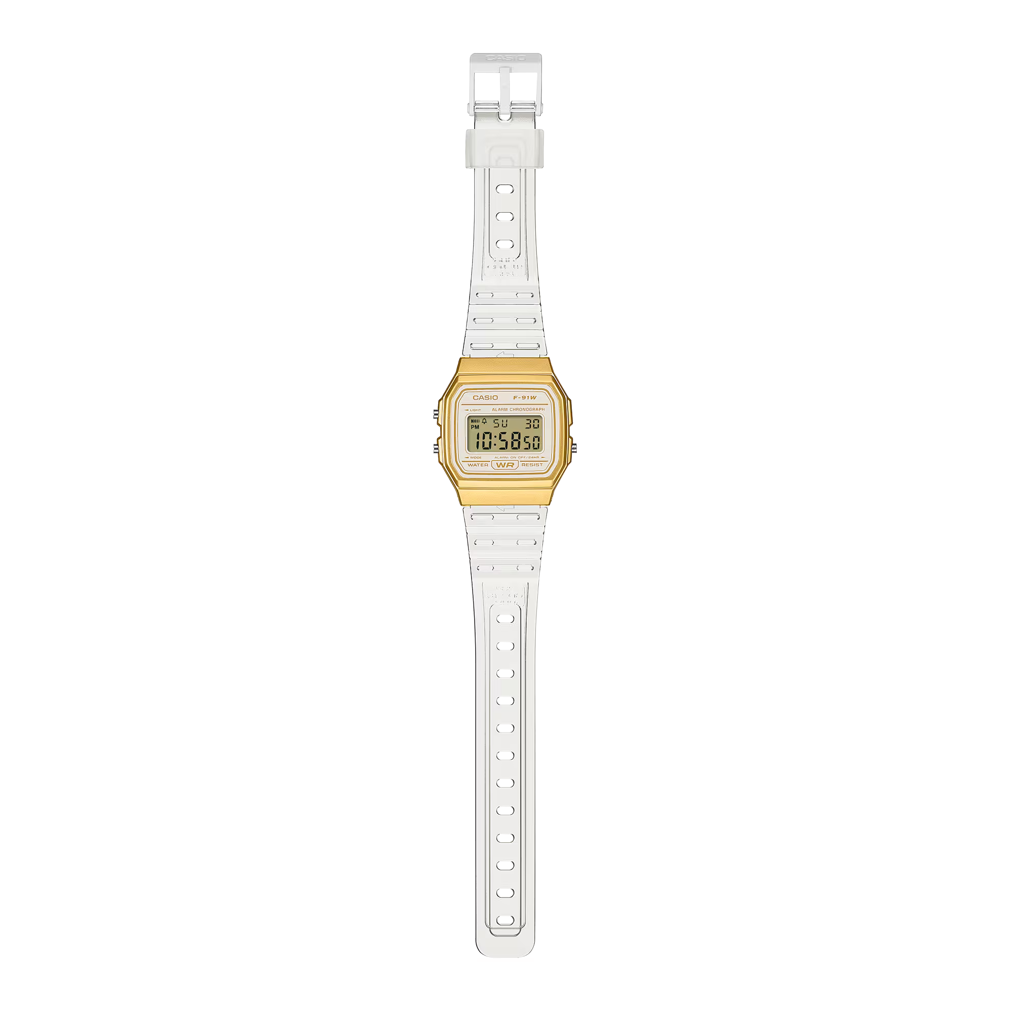 Là một sản phẩm được yêu thích từ lâu, chiếc đồng hồ kỹ thuật số F-91 mỏng nhẹ kết hợp dây đeo trong suốt với vỏ kim loại tạo nên vẻ ngoài mới mẻ.