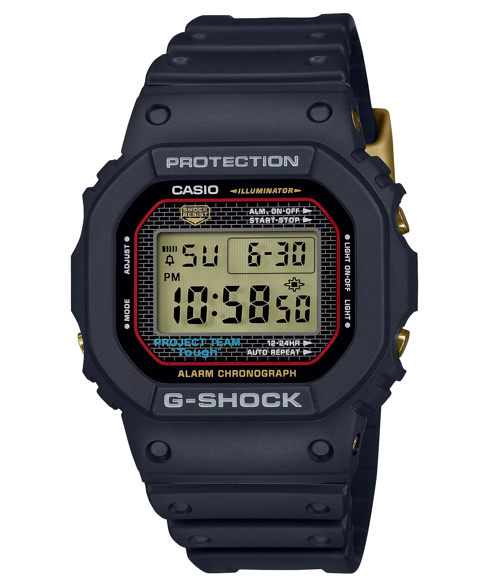 Tạo thêm tuyên bố mạnh mẽ, dứt khoát cho phong cách của bạn với chiếc đồng hồ G-SHOCK tái kết tinh phiên bản giới hạn, kỷ niệm 40 năm thành lập. Chúng tôi đánh dấu lễ kỷ niệm này bằng mẫu đồng hồ DW-5040PG — một sản phẩm sáng tạo mới mẻ lấy cảm hứng từ mẫu G-SHOCK DW-5000 đầu tiên, ra mắt cách đây 40 năm vào tháng 4 năm 1983. Chiếc đồng hồ phiên bản giới hạn được phủ bằng thép không gỉ làm cứng lớp sâu và tái kết tinh đã được phát triển cùng ý tưởng này. Quy trình tái kết tinh và làm cứng lớp sâu được áp dụng cho phần lưng vỏ có khóa vặn, chốt khóa và vòng dây. Lưng vỏ mạ ion màu đen, vòng dây và chốt khóa mạ ion vàng kết hợp với nhau tạo nên vẻ ngoài độc đáo, rạng rỡ nổi bật. Để giảm tác động đến môi trường, đường gờ và dây đeo đều được làm từ nhựa sinh học. Vòng dây được khắc bốn ngôi sao tượng trưng cho số 40, trong khi dòng chữ “PROJECT TEAM 'Tough'” trên mặt số là lời tri ân dành cho đội ngũ phát triển chiếc đồng hồ G-SHOCK đầu tiên. Lưng vỏ được chạm khắc logo kỷ niệm 40 năm do Eric Haze thiết kế, trong khi nút phía dưới bên trái được khắc ngôi sao, tạo nên chiếc đồng hồ kết tinh kỷ niệm 40 năm thành lập G-SHOCK.