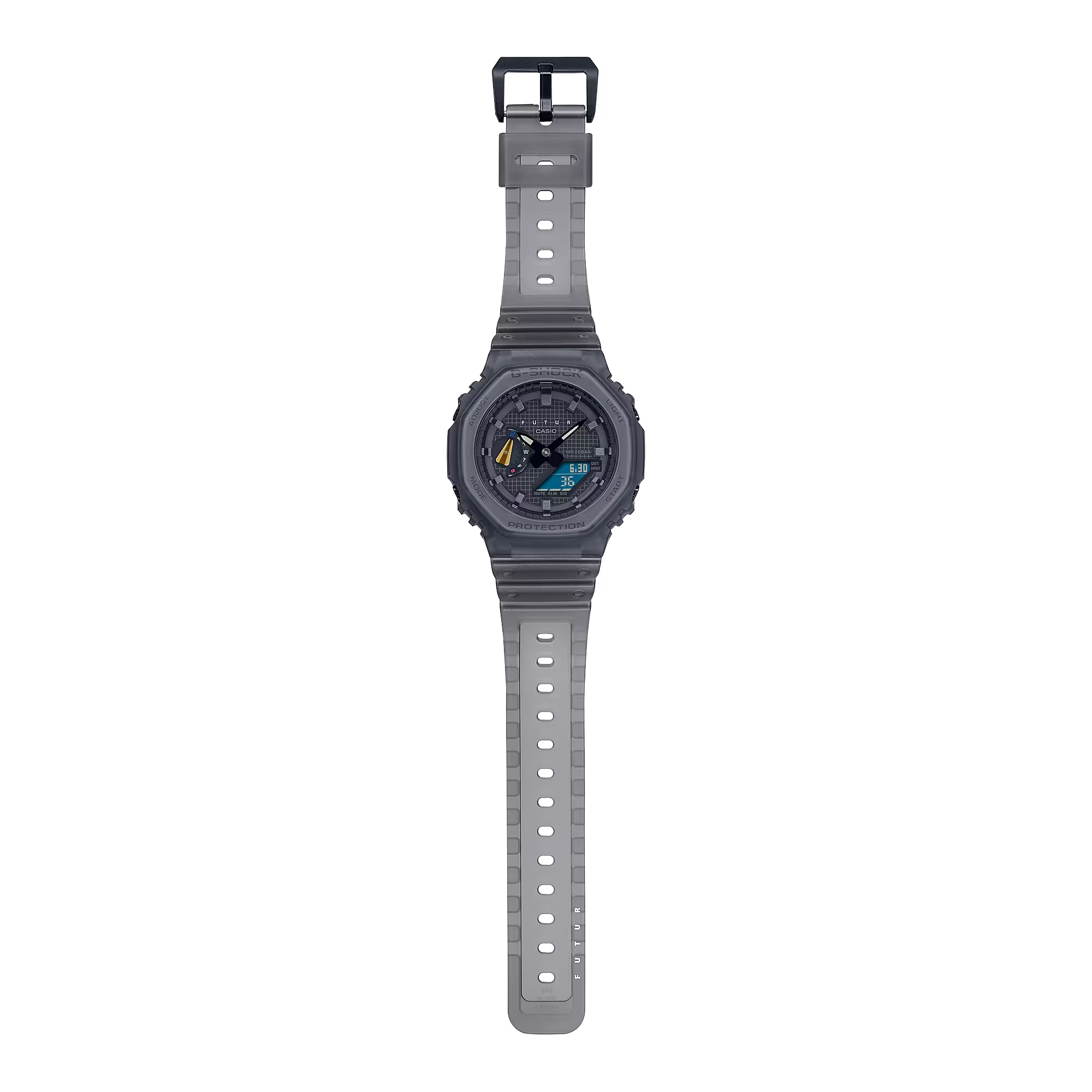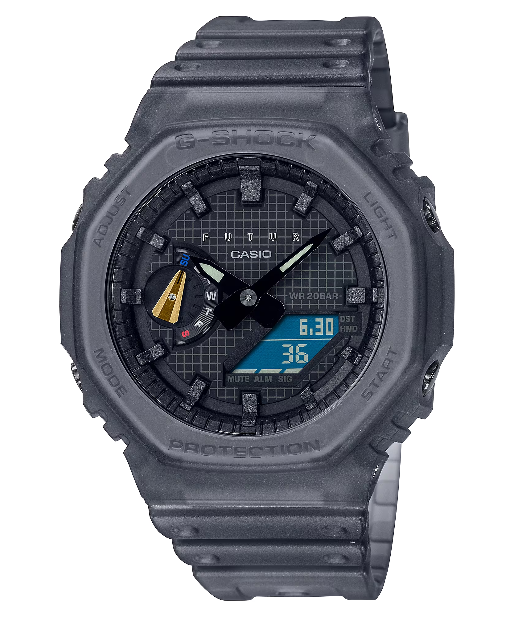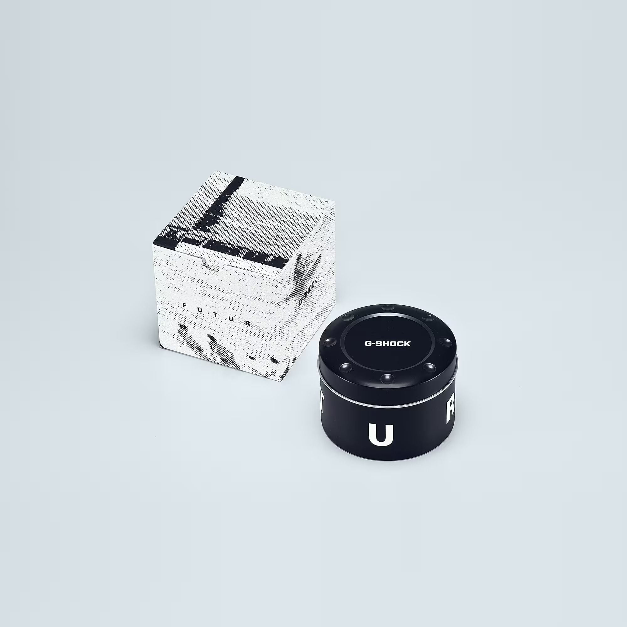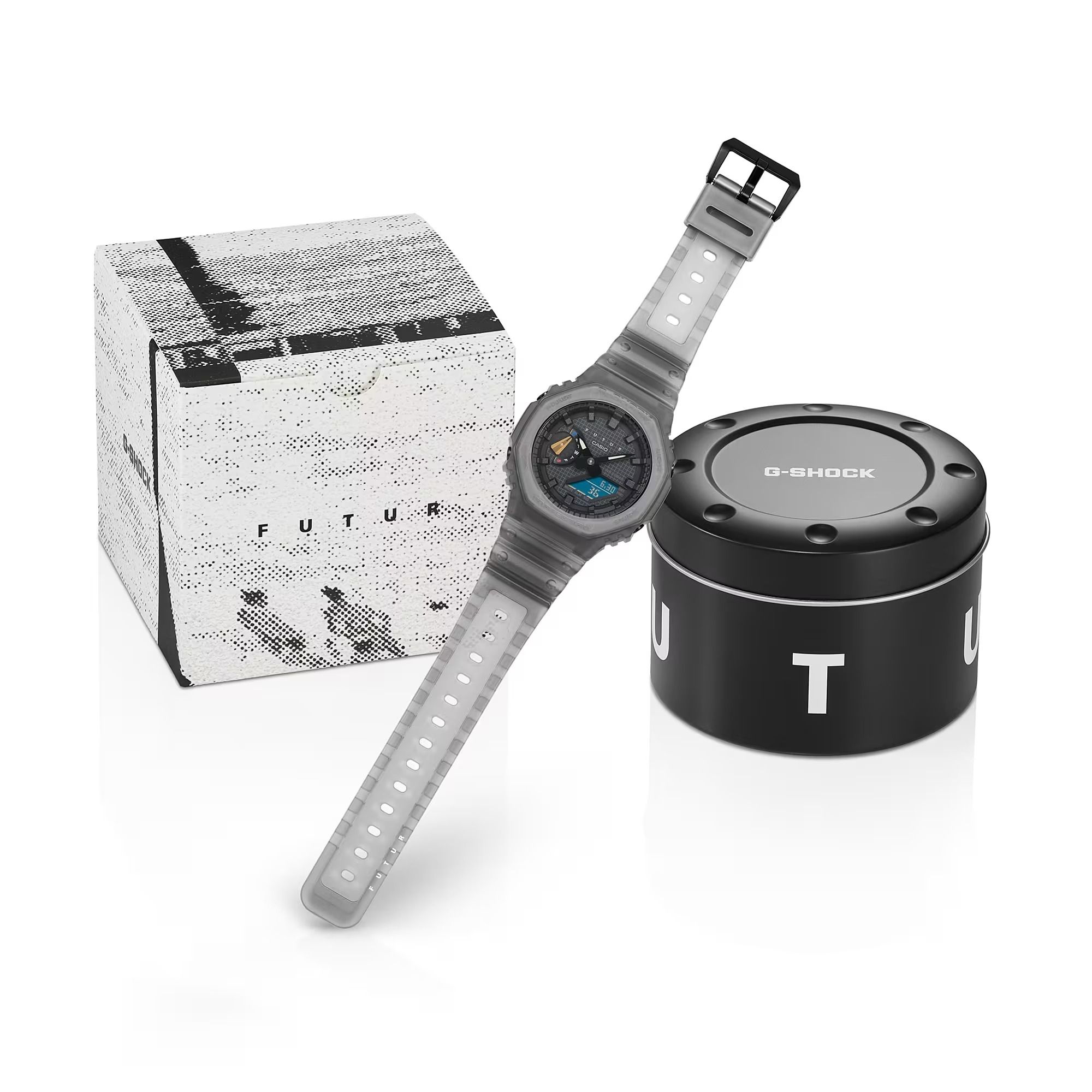 Giới thiệu mẫu đồng hồ hợp tác đặc biệt với FUTUR nhằm kết hợp phong cách thời trang thời thượng từ nước Pháp với sứ mệnh không ngừng của G-SHOCK trong việc đạt được độ bền tối đa. Thiết kế hợp tác này xuất hiện lần đầu với mẫu GA-2100 cùng đường gờ bát giác, kết hợp với các thành phần trong mờ màu xám cơ bản tạo nên phong cách đơn sắc, mang hơi hướng tương lai. Kim chỉ báo bằng vàng, màu quốc kỳ Pháp (xanh dương, trắng và đỏ) là những điểm nhấn nổi bật tô điểm cho mặt số lồng ở vị trí 9 giờ. Thiết kế đơn giản, luôn mới mẻ và không bao giờ lỗi thời là tất cả những điều bạn cần ở mẫu đồng hồ hợp tác giữa một thương hiệu thời trang đường phố được yêu thích và thương hiệu G-SHOCK mạnh mẽ. FUTUR FUTUR được Felix Schaper và Benoit Fredonie thành lập vào tháng 7 năm 2014. Vốn có xuất thân khác nhau, một người là dân trượt ván, người kia làm trong ngành may mặc, cả hai đã tạo nên thương hiệu FUTUR tập trung vào tính thẩm mỹ trau chuốt với các điểm nhấn chất lượng cao lấy cảm hứng từ môn trượt ván.