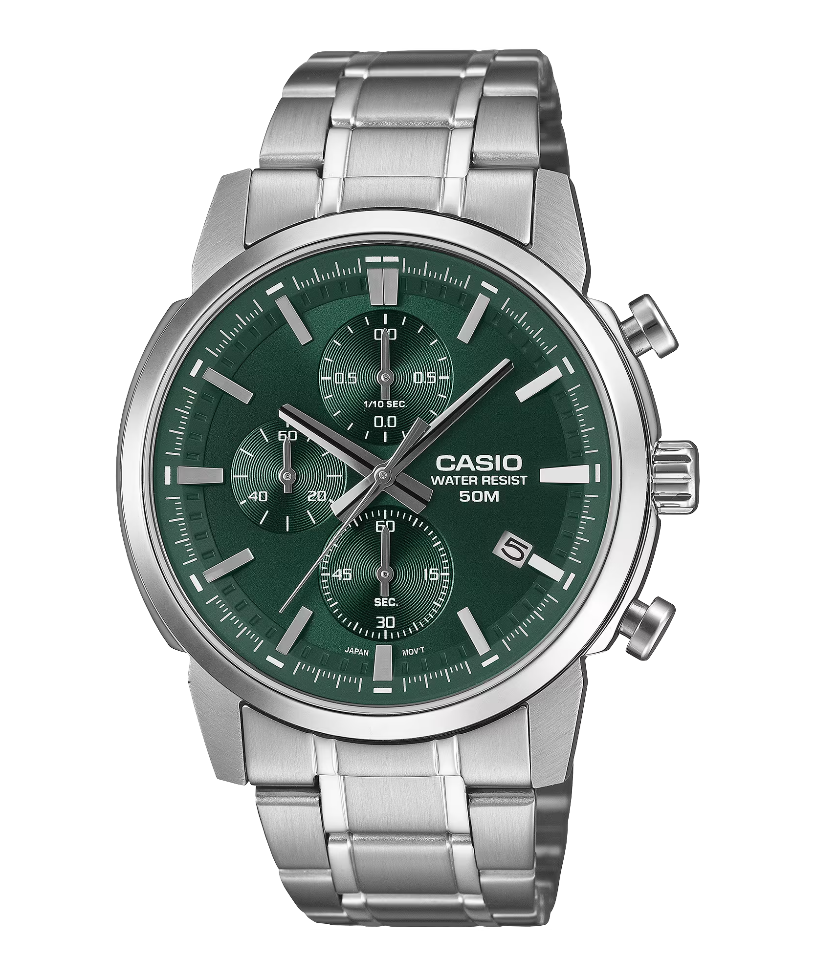 Đồng hồ kim: 3 kim (giờ, phút, giây), 3 mặt số (1/10 giây bấm giờ, phút bấm giờ, giây bấm giờ)