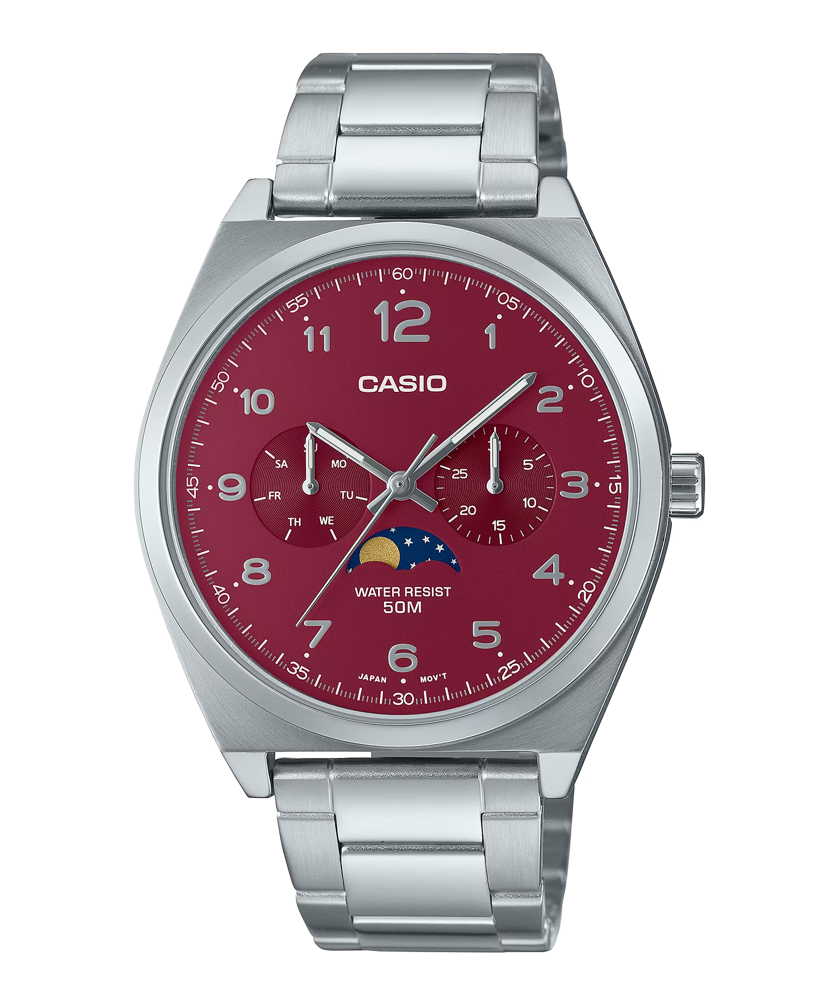 Mẫu đồng hồ kim nổi bật đưa bạn đi một vòng quanh mặt trăng với tính năng theo dõi chu kỳ mặt trăng và nhiều mặt số lồng. Những chiếc đồng hồ này kết hợp thiết kế mặt trăng cổ điển với thời trang hiện đại. Hãy chọn chiếc đồng hồ cho riêng mình để luôn đúng giờ cả trong lẫn ngoài giờ làm việc. Khả năng chống nước tối đa ở độ sâu 50 mét giúp bạn không phải lo lắng khi rửa hoặc đi dưới trời mưa.