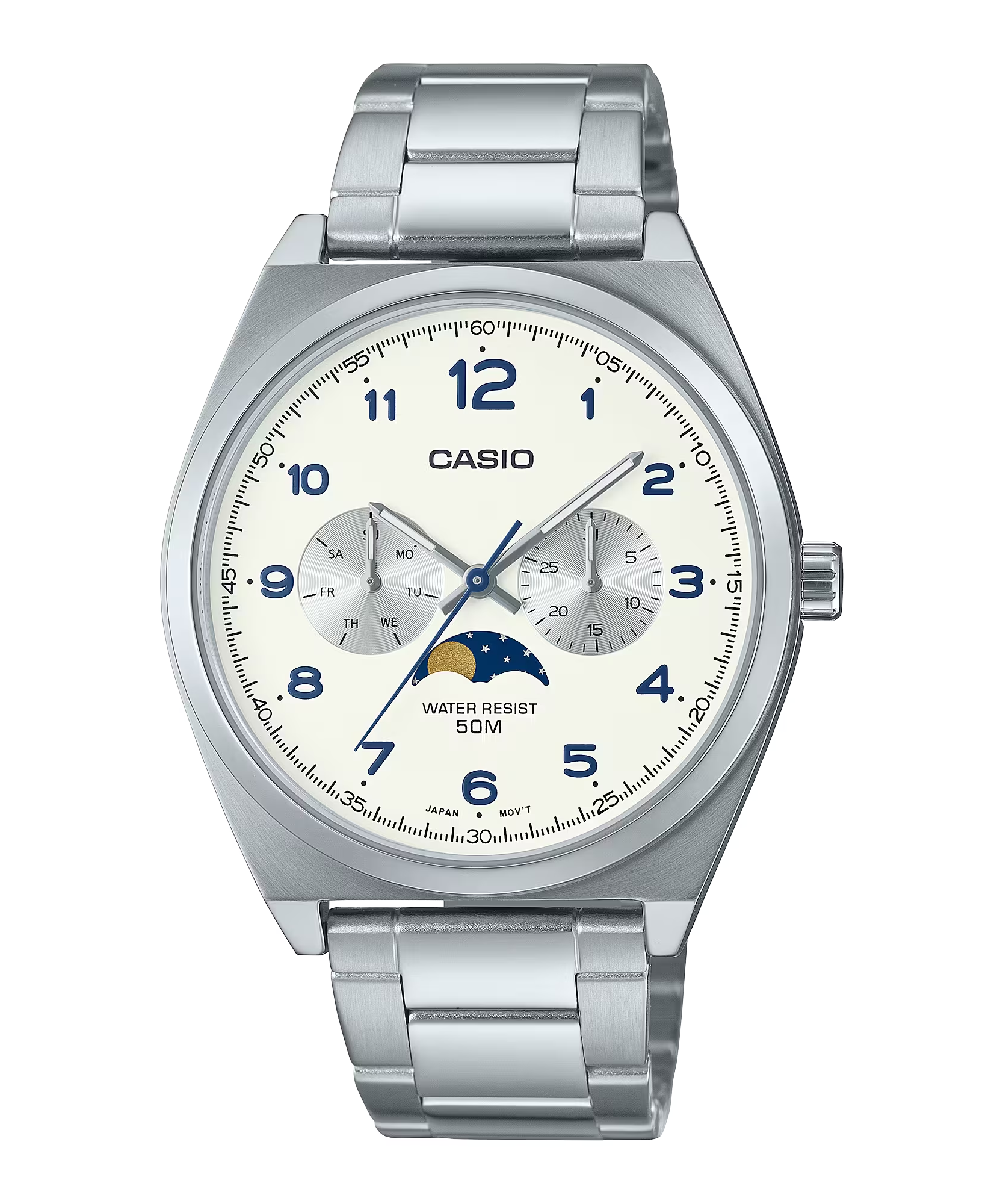Mẫu đồng hồ kim nổi bật đưa bạn đi một vòng quanh mặt trăng với tính năng theo dõi chu kỳ mặt trăng và nhiều mặt số lồng. Những chiếc đồng hồ này kết hợp thiết kế mặt trăng cổ điển với thời trang hiện đại. Hãy chọn chiếc đồng hồ cho riêng mình để luôn đúng giờ cả trong lẫn ngoài giờ làm việc. Khả năng chống nước tối đa ở độ sâu 50 mét giúp bạn không phải lo lắng khi rửa hoặc đi dưới trời mưa.