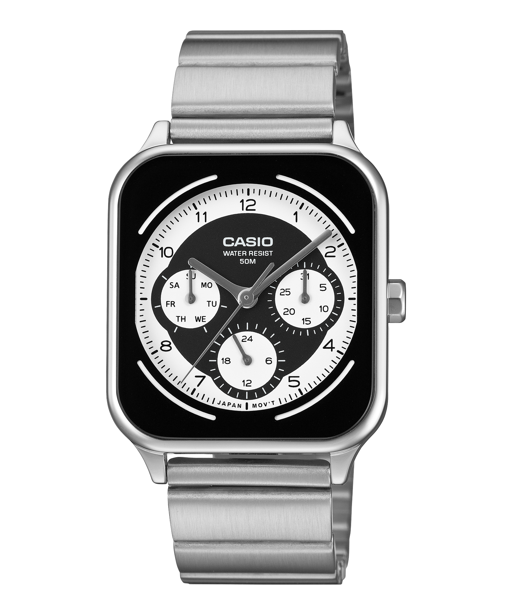 Mặt số lồng tiện dụng hiển thị thứ, ngày và đồng hồ 24 giờ. Tính năng chống nước ở độ sâu 50 mét giúp bạn sử dụng hàng ngày mà không phải lo lắng ngay cả trong những ngày mưa.