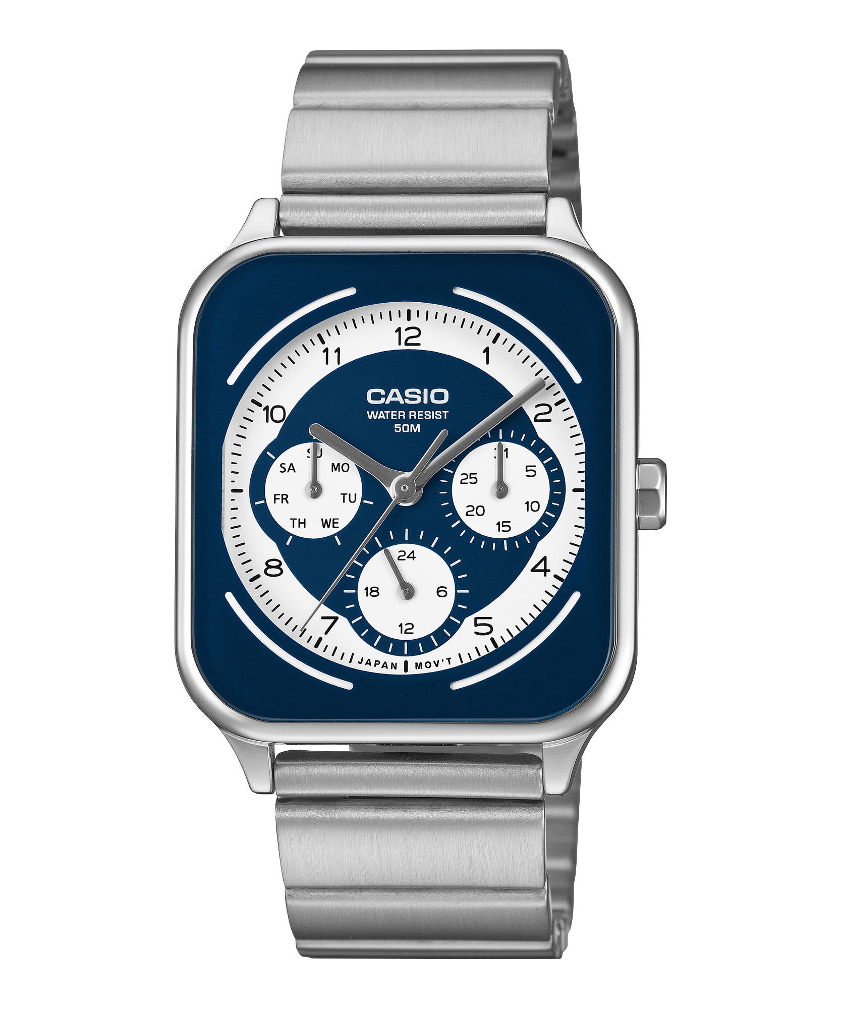 Mặt số lồng tiện dụng hiển thị thứ, ngày và đồng hồ 24 giờ. Tính năng chống nước ở độ sâu 50 mét giúp bạn sử dụng hàng ngày mà không phải lo lắng ngay cả trong những ngày mưa.