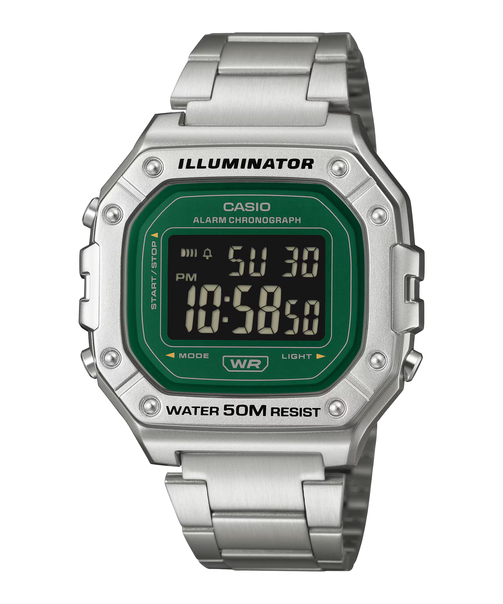 Khám phá sắc xanh tươi mát với chiếc đồng hồ kỹ thuật số cổ điển có mặt số màu xanh lá.