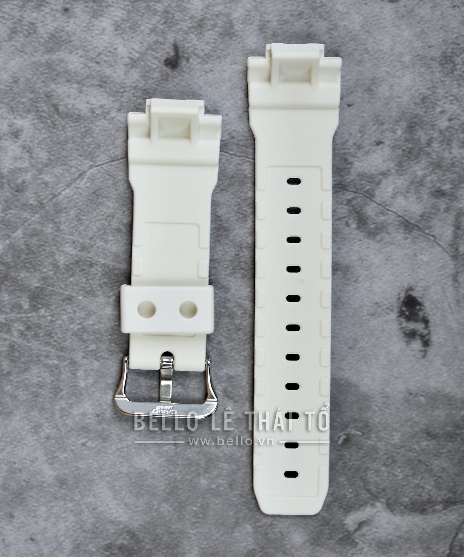 Bello chuyên thay dây đồng hồ Casio, G-Shock, Baby-G, Edifice chính hãng. Đây là phụ kiện Dây đồng hồ Casio chính hãng từ nhà máy Casio - Casio Genuine Factory Parts Dây trắng bóng với họa tiết vân 3D và móc khóa bạc bóng