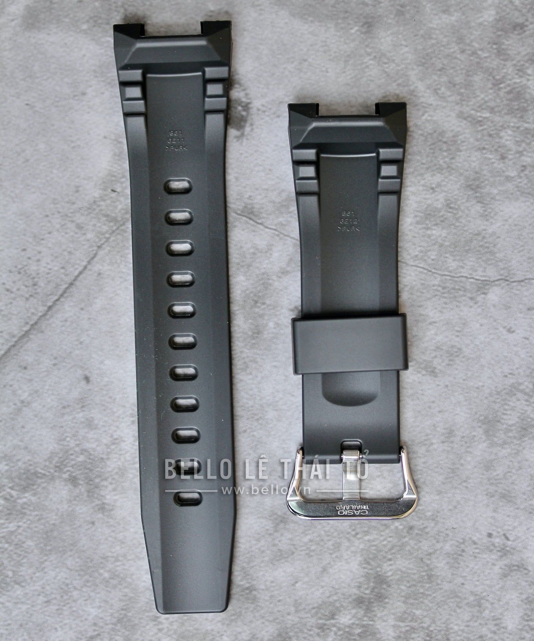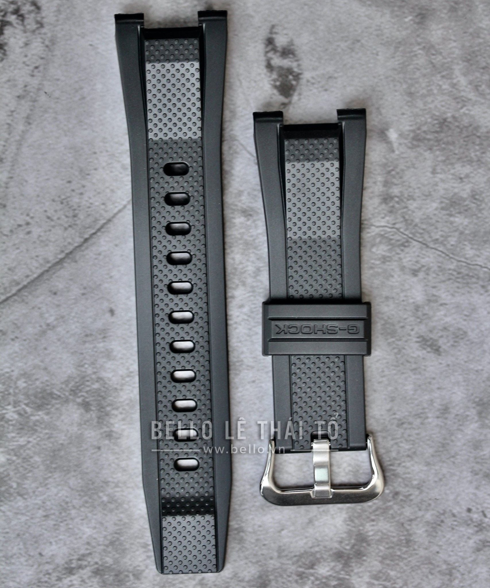 Bello chuyên thay dây đồng hồ Casio, G-Shock, Baby-G, Edifice chính hãng. Đây là phụ kiện Dây đồng hồ Casio chính hãng từ nhà máy Casio - Casio Genuine Factory Parts Dây đen nhám vân nổi với móc khóa bạc bóng