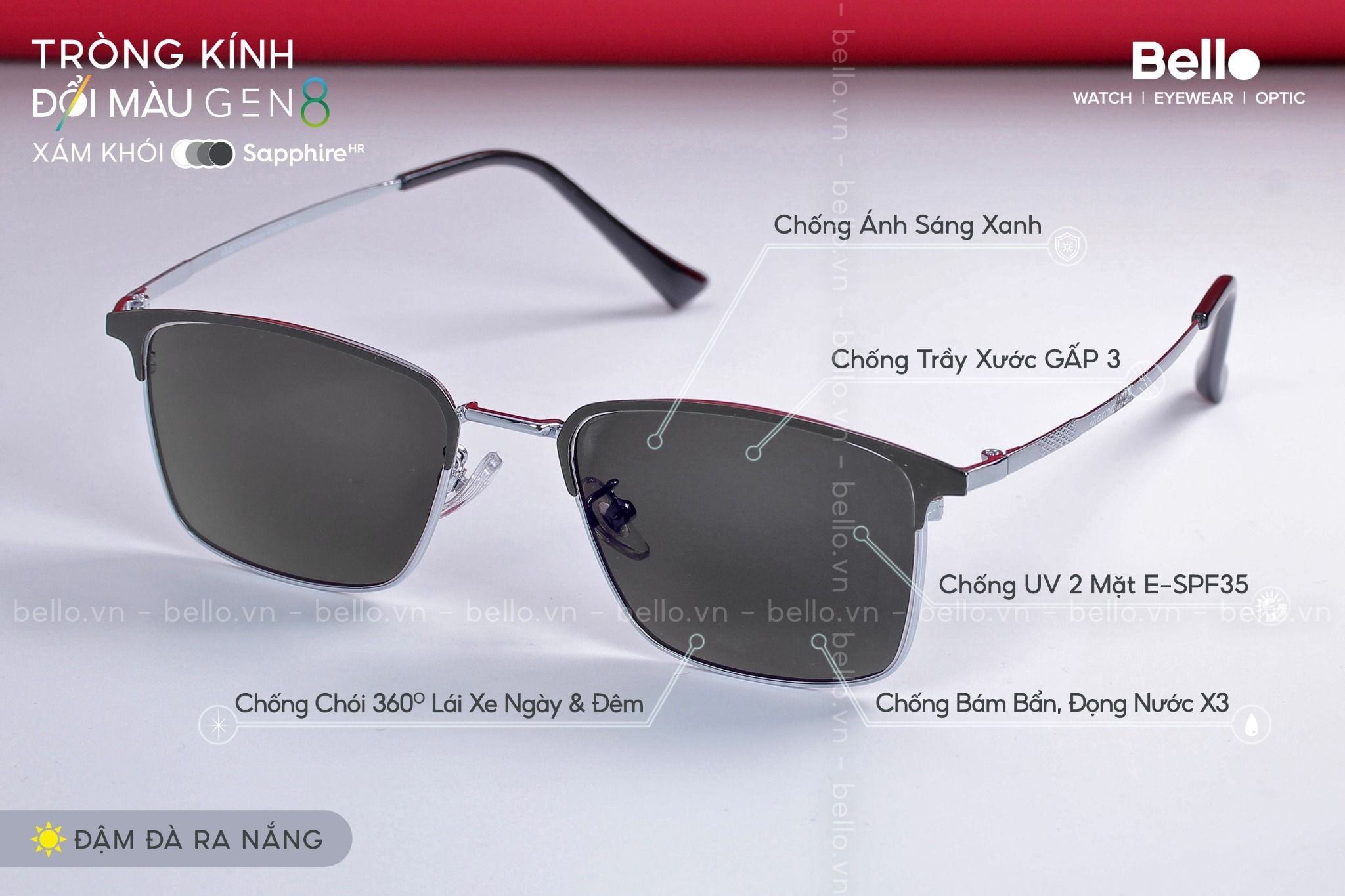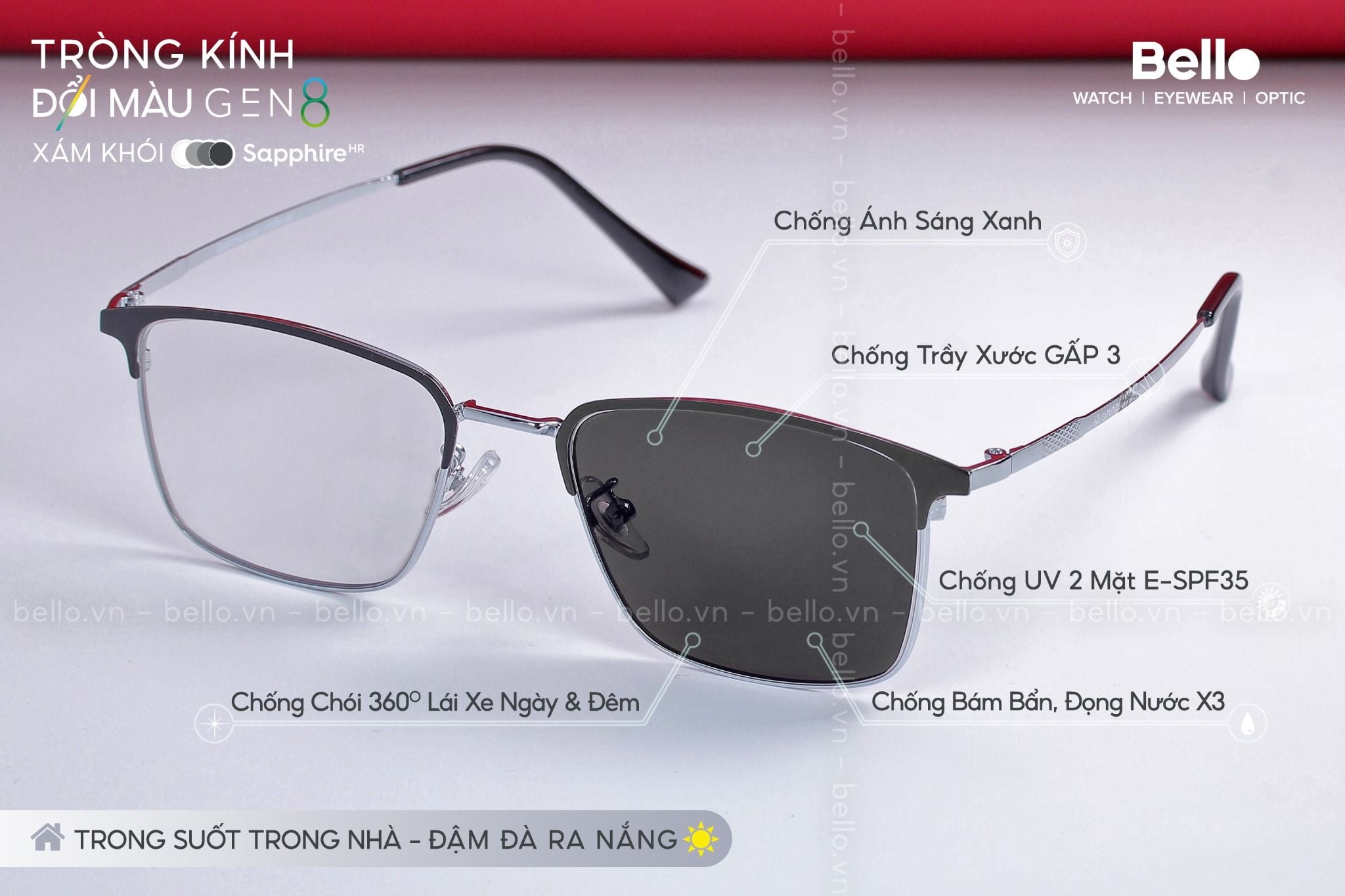 Tròng Kính Đổi Màu Essilor Transitions Signature Gen 8 là thế hệ tròng kính đổi màu cao cấp, tân tiến nhất trên thị trường hiện nay, đổi màu Gen 8 là dòng tròng kính bán chạy số 1 của Essilor tại Việt Nam và cũng là dòng tròng kính giúp Bello làm nên tên tuổi trên thị trường tròng kính tốt tại Việt Nam.