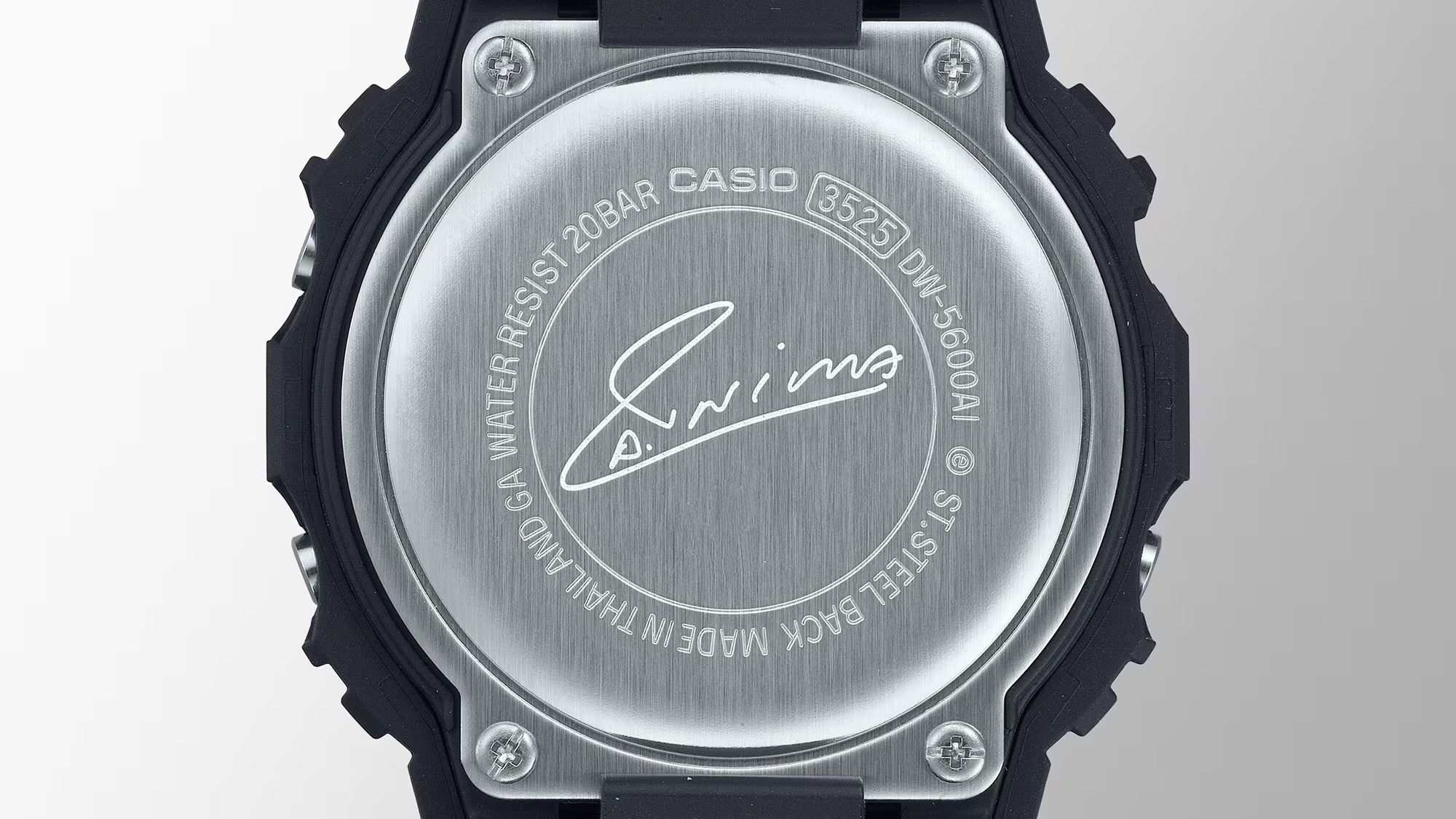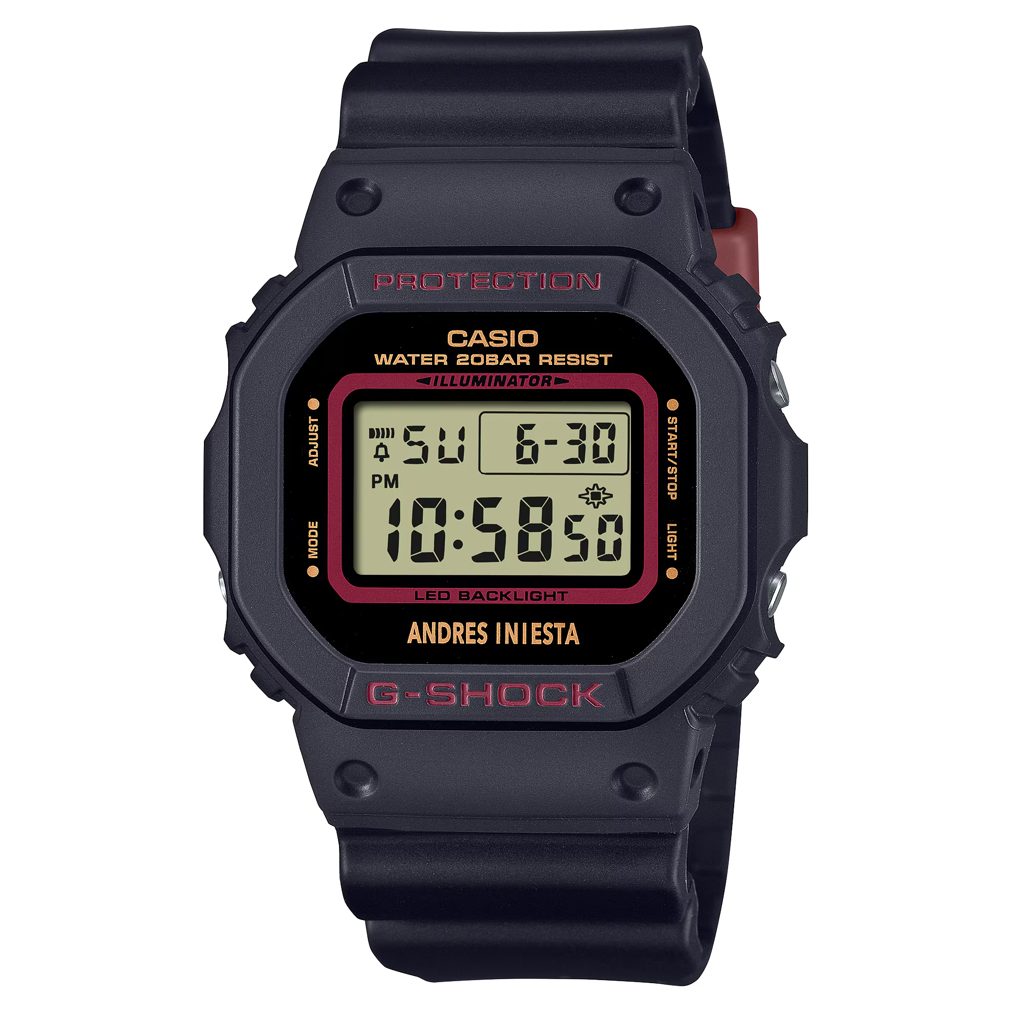 Chúng tôi bắt đầu với DW-5600, biểu tượng của G-SHOCK và giới thiệu nhựa sinh học cho gờ và dây đeo màu đen được tạo điểm nhấn bằng màu đỏ sẫm, màu đặc trưng của Iniesta. Con số “8” được khắc laser trên nút ở vị trí 8 giờ tượng trưng cho số áo thi đấu nổi tiếng của anh ấy. Một thông điệp do chính Iniesta viết tay – “Làm chủ cuộc chơi” – được in trên dây đeo và vòng dây đeo có logo chính thức của anh ấy. Bật đèn nền để xem hình bóng Iniesta đang ghi bàn thắng huyền thoại tại World Cup.