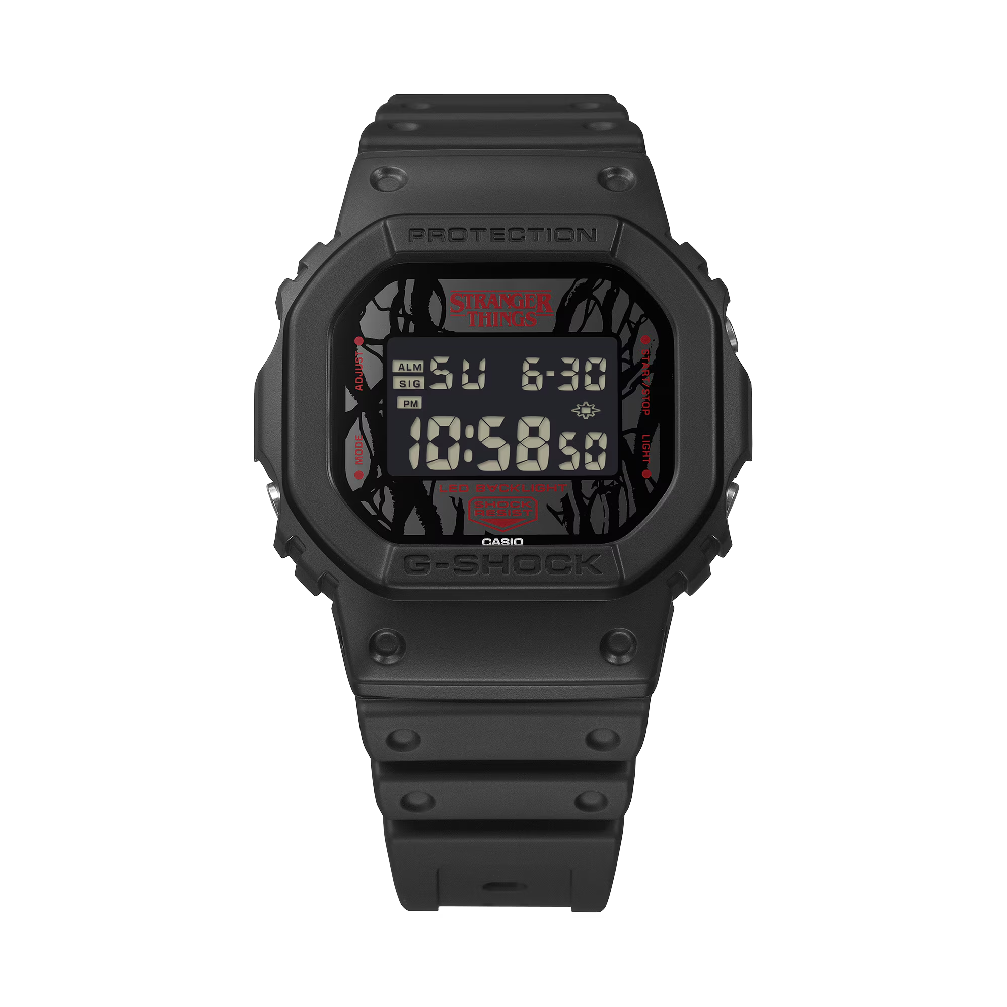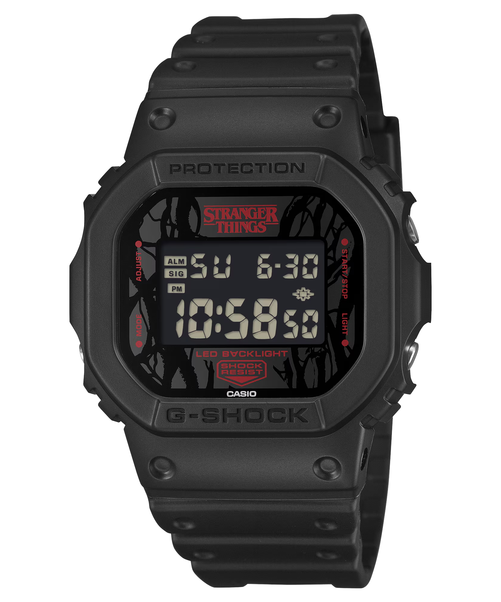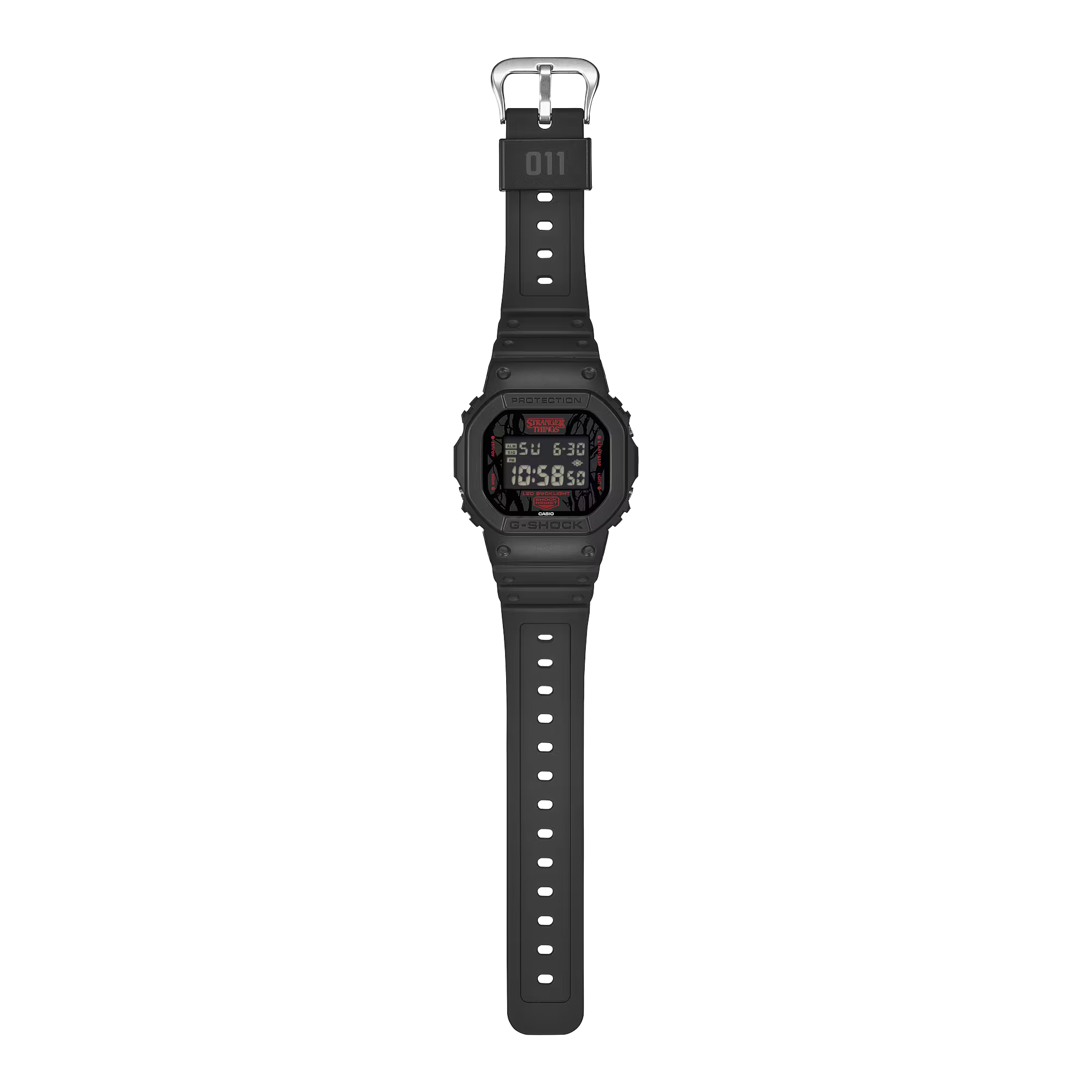 Chiếc đồng hồ này dựa trên mẫu DW-5600. Lấy cảm hứng từ hai thế giới song song của câu chuyện, thực tại quen thuộc và “Thế giới ngược” kỳ quái — thiết kế đã lồng ghép những yếu tố chính của loạt phim vào từng chi tiết.