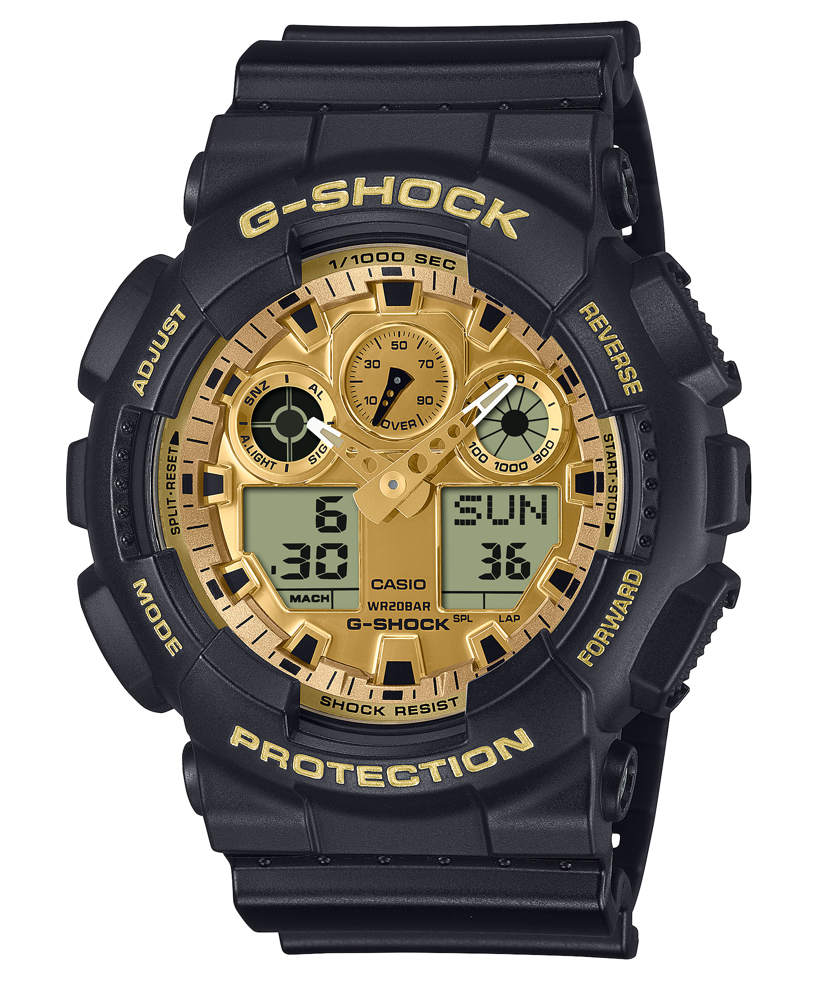 Hãy chọn GA-100GGB-1A9 hoặc GA-010GGB-1A9 với mặt đồng hồ lấp lánh sắc vàng đặc trưng, nhờ công nghệ lắng đọng hơi màu vàng rực rỡ và màn hình LCD gương màu vàng. Dây đeo và vỏ máy được hoàn thiện bằng lớp phủ bóng, mang đến vẻ ngoài bóng bẩy, sang trọng.