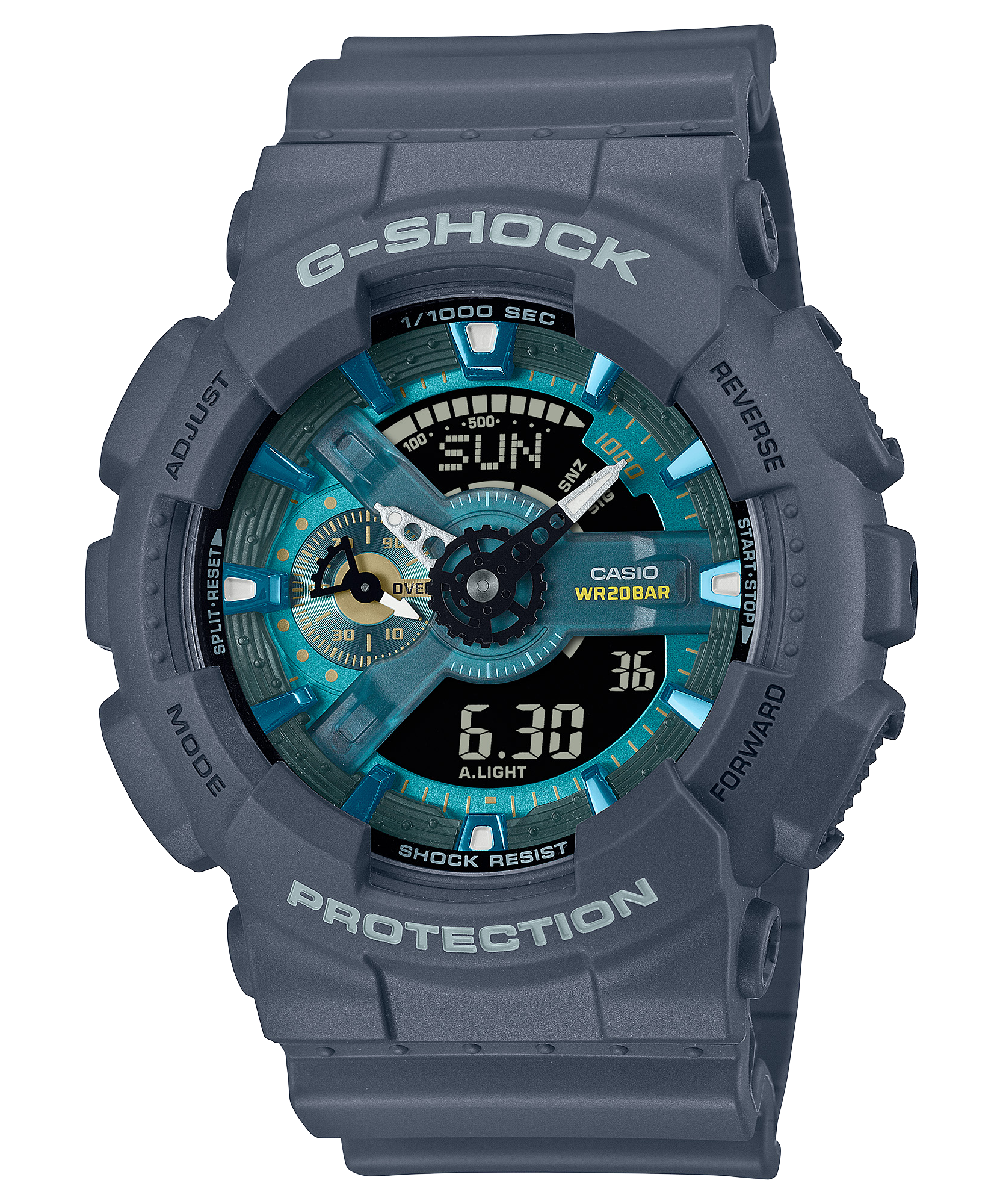 Ga-110 mạnh mẽ và bền bỉ bắt đầu với màu cơ bản là màu xanh hải quân. Sau đó, lấy cảm hứng từ khu bảo tồn tươi mát của một hồ ốc đảo, những điểm nhấn màu xanh lam lục làm nổi bật mặt đồng hồ, gợi lên hình ảnh làn nước mát lạnh lấp lánh phản chiếu những tia nắng mặt trời.