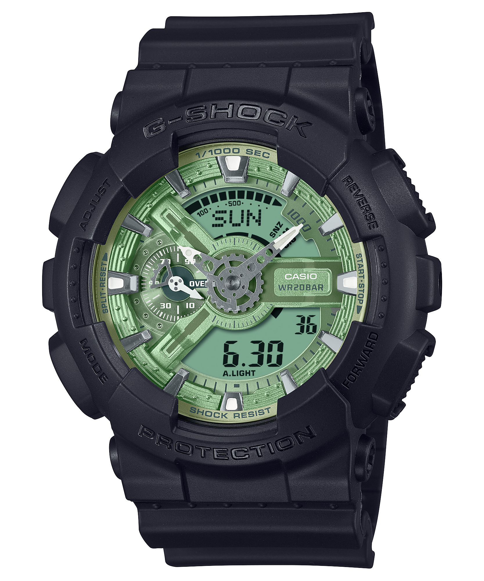 GA-110 với vỏ lớn đặc biệt có màu đen cổ điển dành cho dây đeo và gờ, sau đó chuyển sang màu sắc đậm trên mặt số.