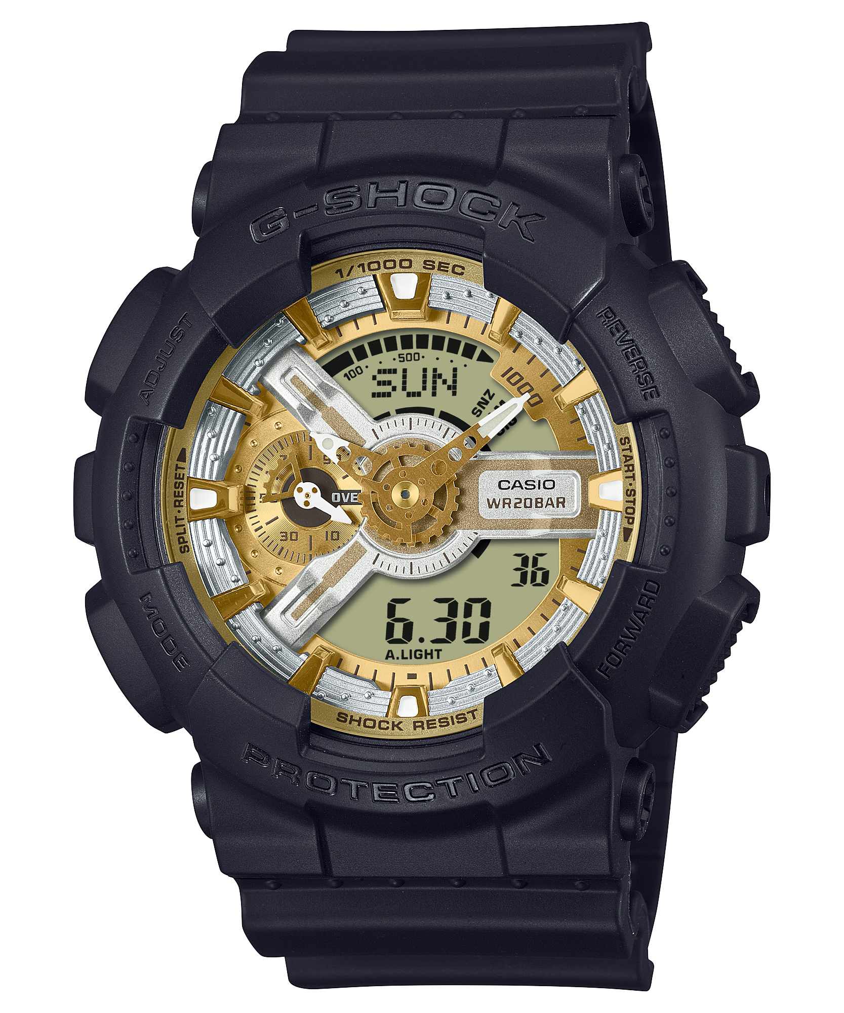 GA-110 với vỏ lớn đặc biệt có màu đen cổ điển dành cho dây đeo và gờ, sau đó chuyển sang màu sắc đậm trên mặt số.