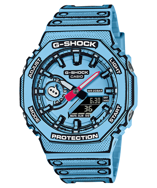 GA-2100 với viền hình bát giác mang tính biểu tượng có dây đeo, viền và mặt số được in bằng kỹ thuật screentone (giấy hoa văn) được các họa sĩ truyện tranh sử dụng để áp dụng họa tiết và tạo bóng, tăng thêm chiều sâu cho các bản vẽ hai chiều.