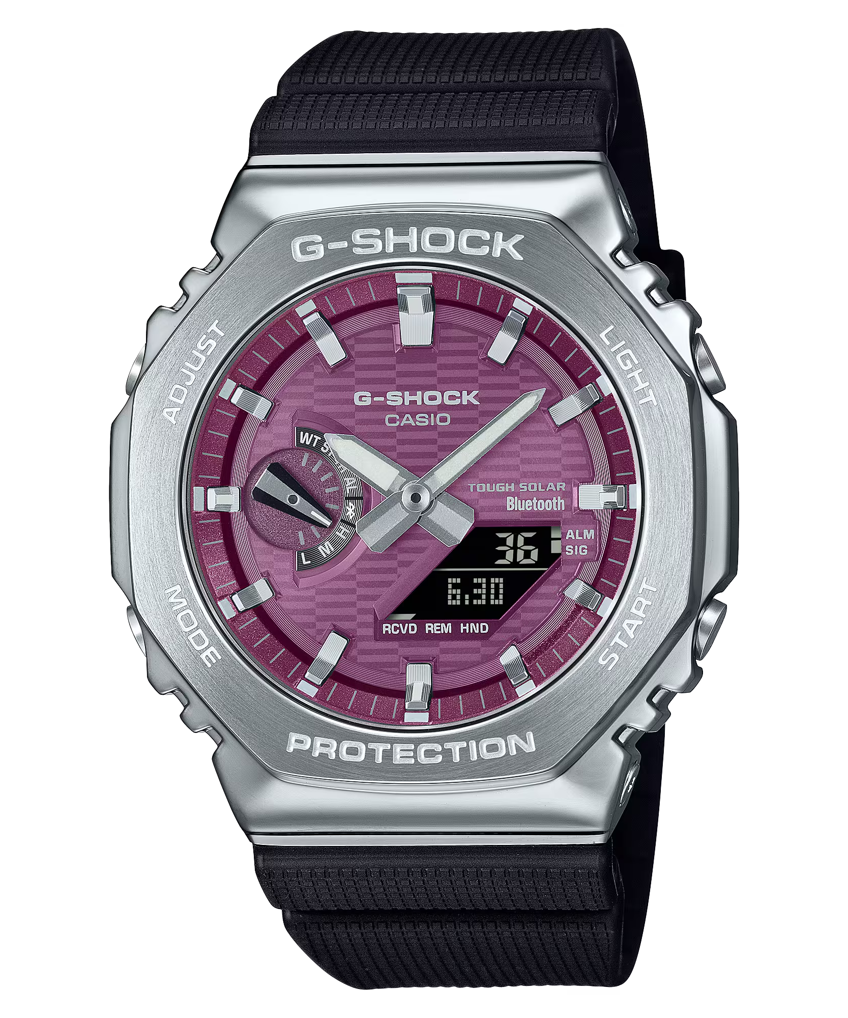 Hãy chọn sự kết hợp màu sắc yêu thích của bạn với lớp hoàn thiện lắng đọng hơi nước — GBM-2100A-2B với mặt số xanh dương và vạch chỉ giờ màu bạc, GBM-2100A-4B với mặt số đỏ tía và vạch chỉ giờ màu bạc, hoặc GBM-2100A-8B với mặt số vàng nhạt và vạch chỉ giờ màu đen.