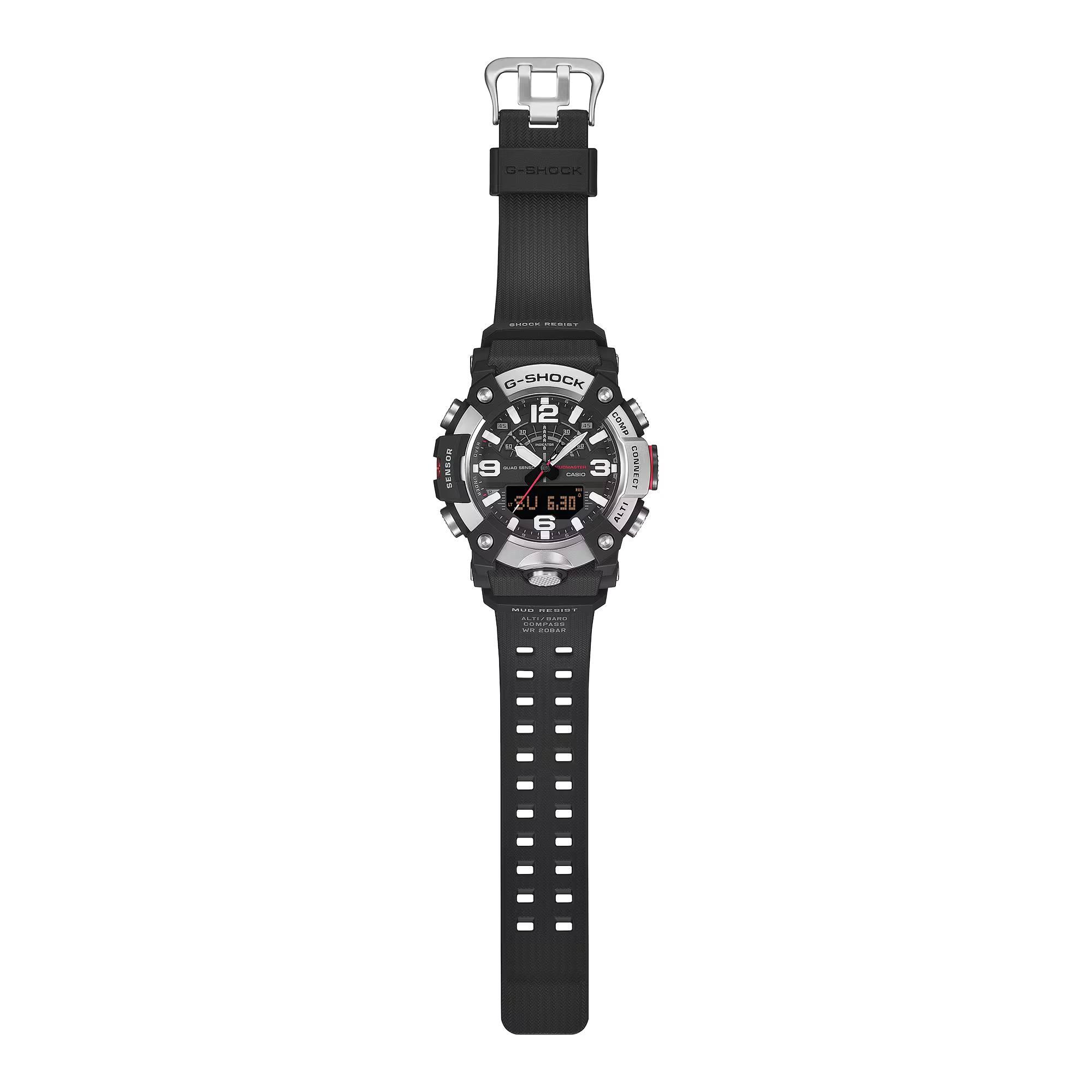 Đồng hồ MUDMASTER GG-B100X sử dụng chất liệu carbon có độ cứng cao trên vỏ máy giúp hạn chế hư hỏng và chạy chậm, đồng thời đảm bảo độ kín khí và khả năng chống va đập cao. Với bộ lọc để chống bùn, mặt sau bằng thép không gỉ và nắp lưng được làm từ nhựa tinh xảo chống va đập pha lẫn sợi thủy tinh, mẫu đồng hồ này có khả năng chống bụi và bùn rất cao. Đường gờ cũng được làm từ ba lớp nhựa tinh chế có pha sợi carbon. Thiết kế chắc chắn gợi nhớ đến những bình xăng gắn trên các xe địa hình đủ mạnh mẽ để vượt qua những địa hình khắc nghiệt nhất. Các thành phần chính của vỏ và dây đeo đều được làm bằng nhựa sinh học. Được sản xuất bằng cách sử dụng các nguồn hữu cơ tái tạo, vật liệu này được kỳ vọng sẽ giúp giảm tác động đến môi trường.