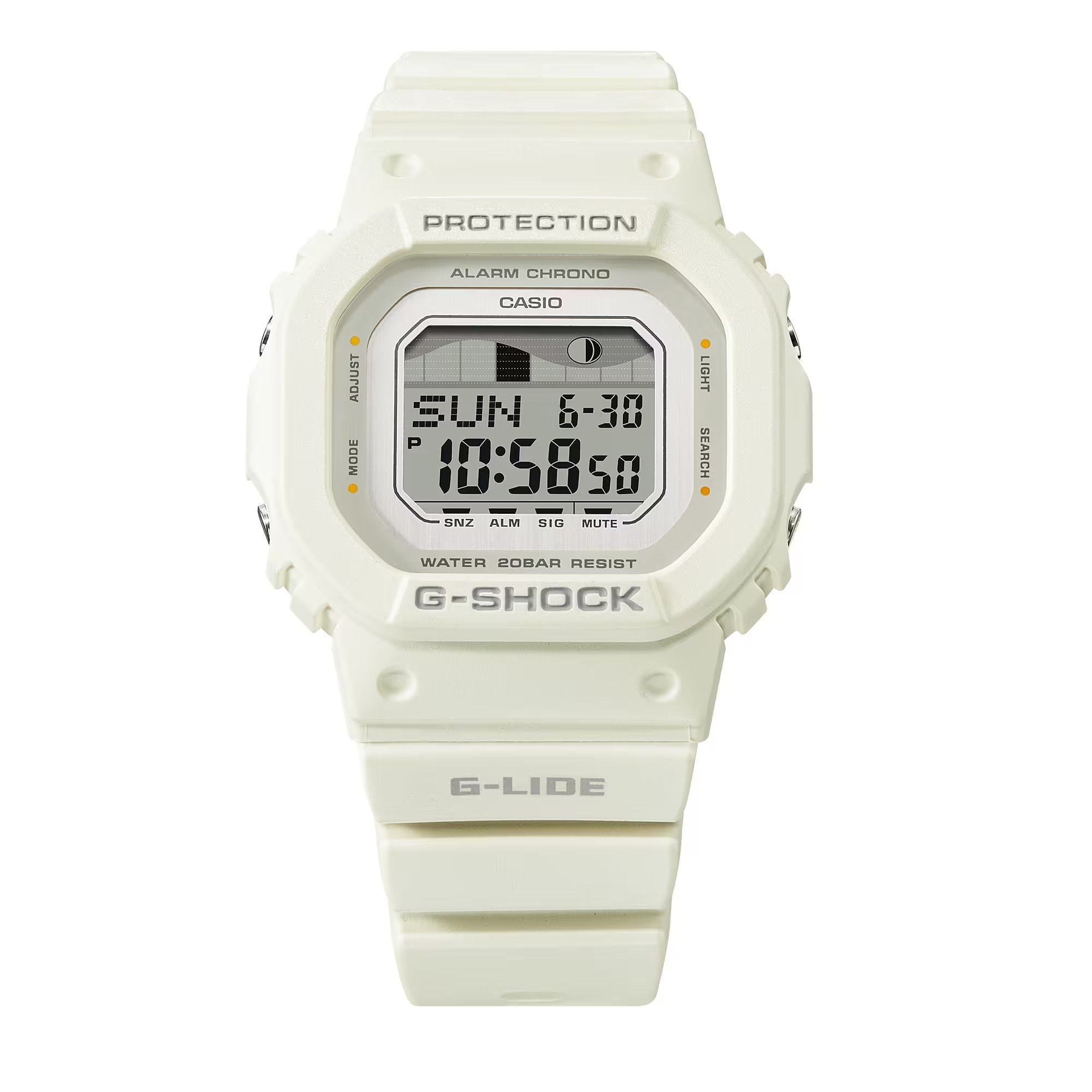 GLX-S5600, mẫu đồng hồ nhỏ hơn một chút so với mẫu cơ bản G-LIDE, có màu đất và thiết kế đậm chất bãi biển, gợi nhớ những chuyến lướt sóng gợi lên cảm giác hòa nhập với thiên nhiên.