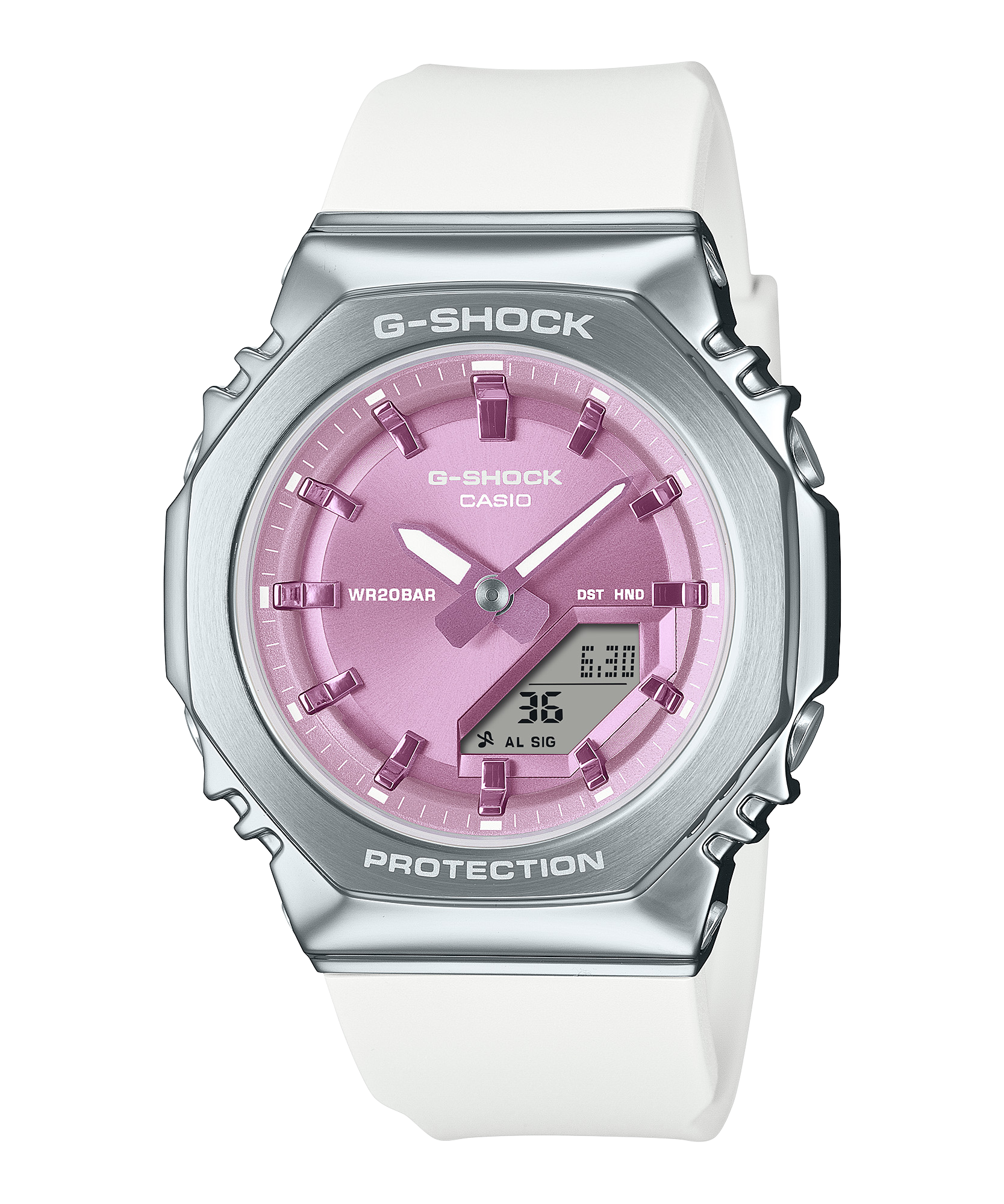 Mặt số đầy màu sắc hợp thời trang với tông màu be nhã nhặn và tím quyến rũ mang đến nét tinh tế và tỏa sáng cho cổ tay. Lớp hoàn thiện dạng đường mảnh của gờ kim loại hình bát giác bổ sung thêm kết cấu đẹp mắt, mặt số kết hợp các chi tiết kim loại tạo nên nét sang trọng trong thiết kế phẳng với các vạch chỉ giờ và màn hình LCD được định hình rõ ràng.