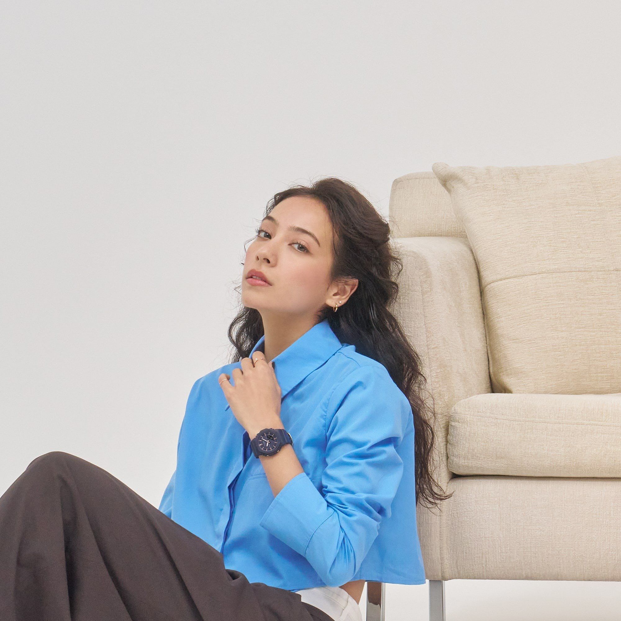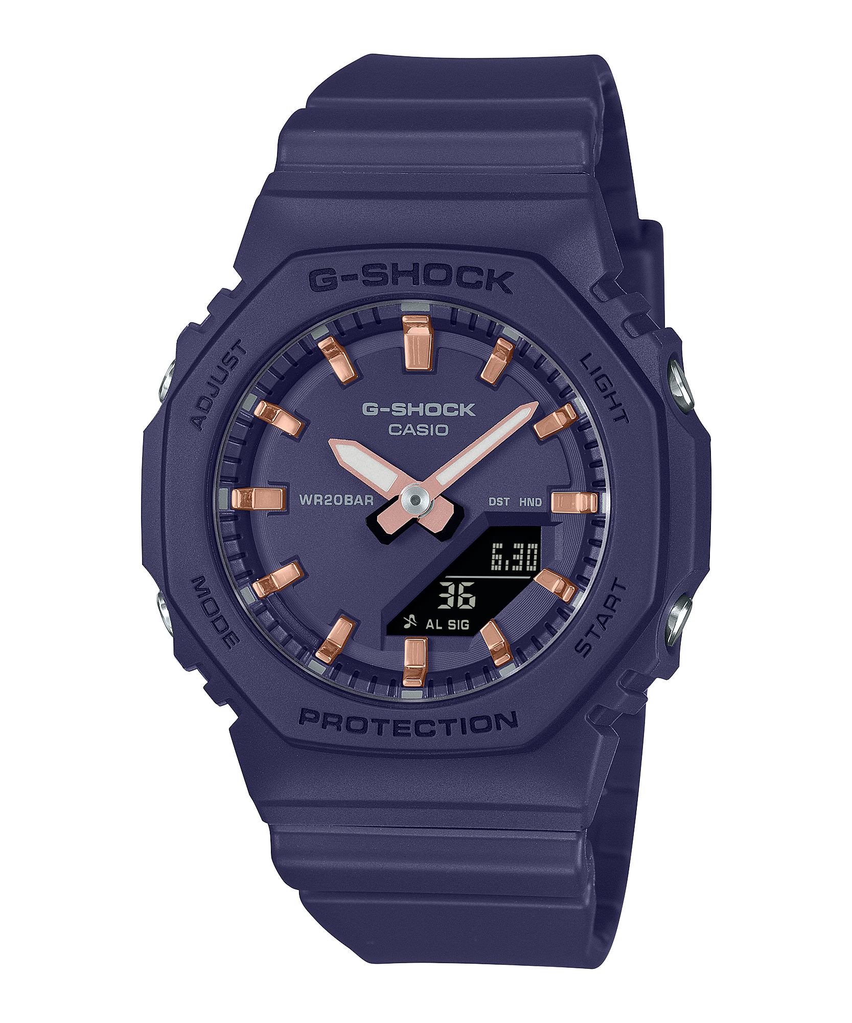 GMA-P2100 có các vạch chỉ giờ thanh lịch được hoàn thiện bằng phương pháp lắng đọng hơi màu vàng hồng và thiết kế nhỏ gọn để vừa vặn với cổ tay nhỏ hơn với sự thoải mái hoàn toàn.
