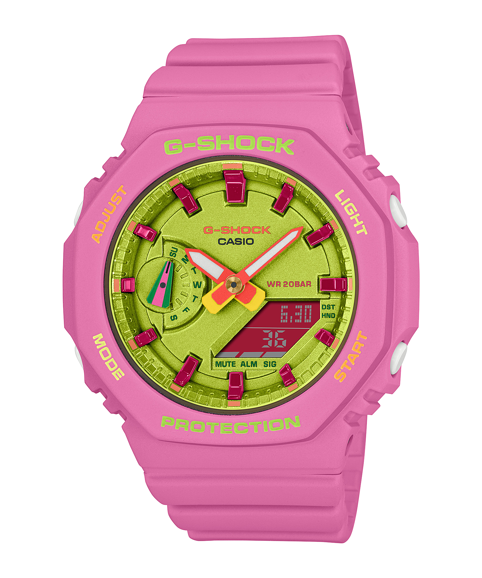 Tô sáng ngày hè với những màu sắc rực rỡ của mẫu đồng hồ G-SHOCK. Mẫu đồng hồ GMA-S2100 có mặt số phẳng và các vạch chỉ giờ đơn giản. Mỗi bộ phận đều mang đến màu sắc khác nhau để bạn tận hưởng những ngày lễ ngập tràn ánh nắng nhất trong năm một cách vui vẻ.