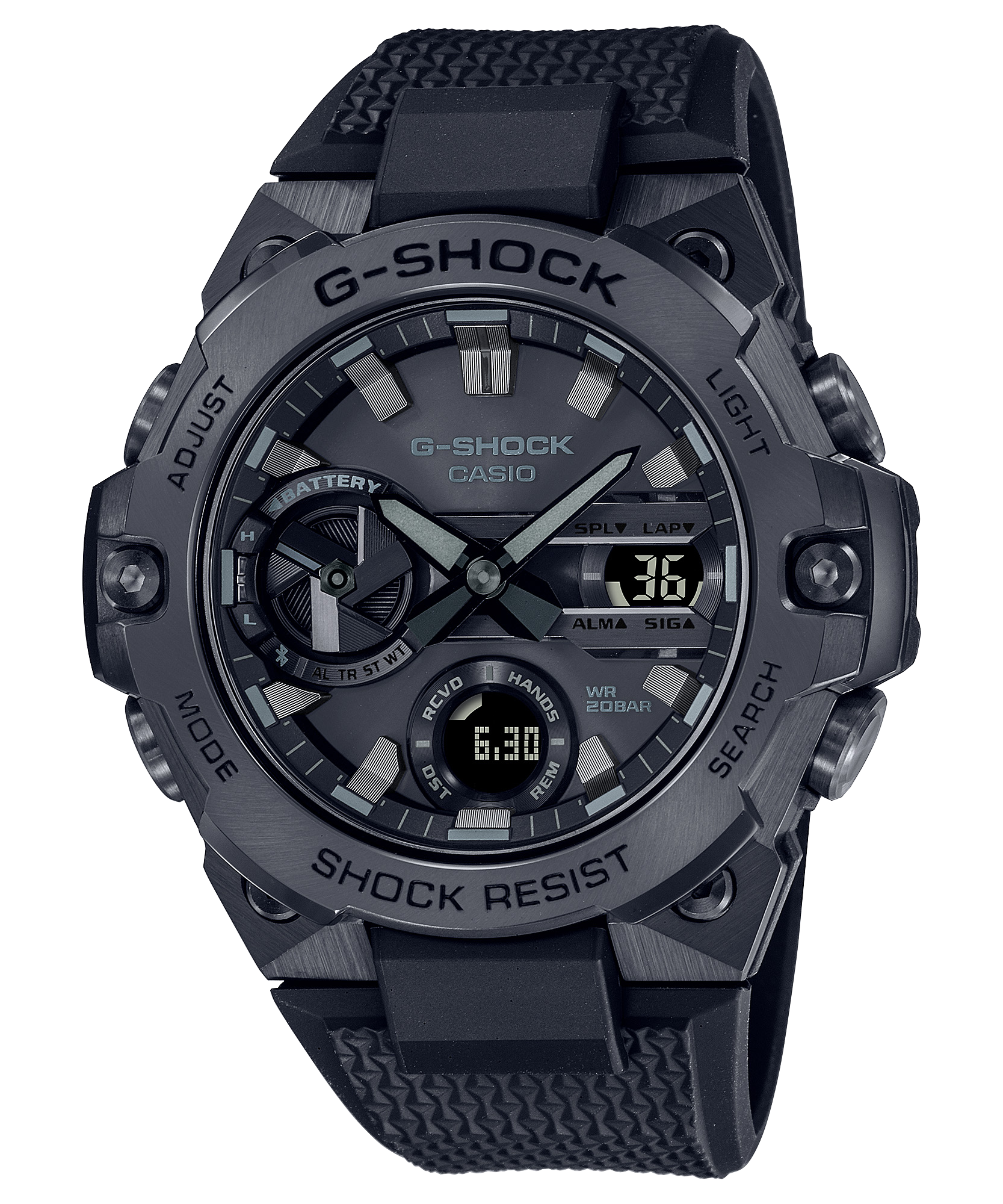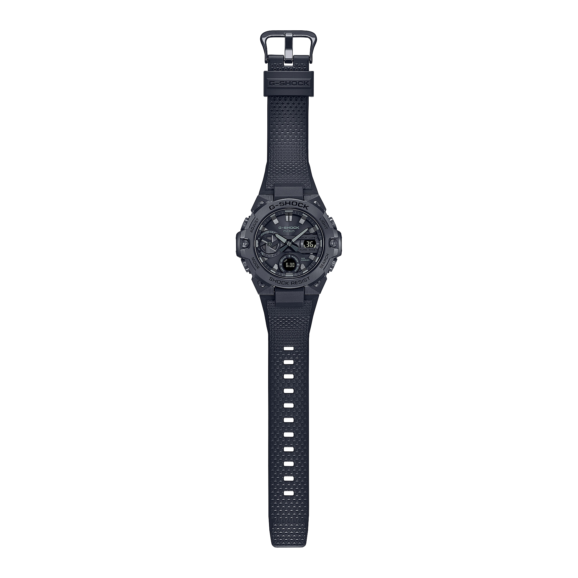 Đắm mình trong nét đẹp tinh tế, độc lạ với sự kết hợp giữa các thành phần nhựa resin và kim loại của G-STEEL trong mẫu đồng hồ G-SHOCK đen tuyền được ưa chuộng. Cấu trúc cứng cáp kết hợp với thiết kế phong cách tạo nên đường gờ kim loại mạ ion đen trên nền đen thăm thẳm. Với cấu kiện kết hợp thanh mảnh và cấu trúc Bảo vệ lõi carbon, mẫu đồng hồ GST-B400 đen tuyền tạo nên phong cách thời trang sành điệu cho bạn trong mọi tình huống.