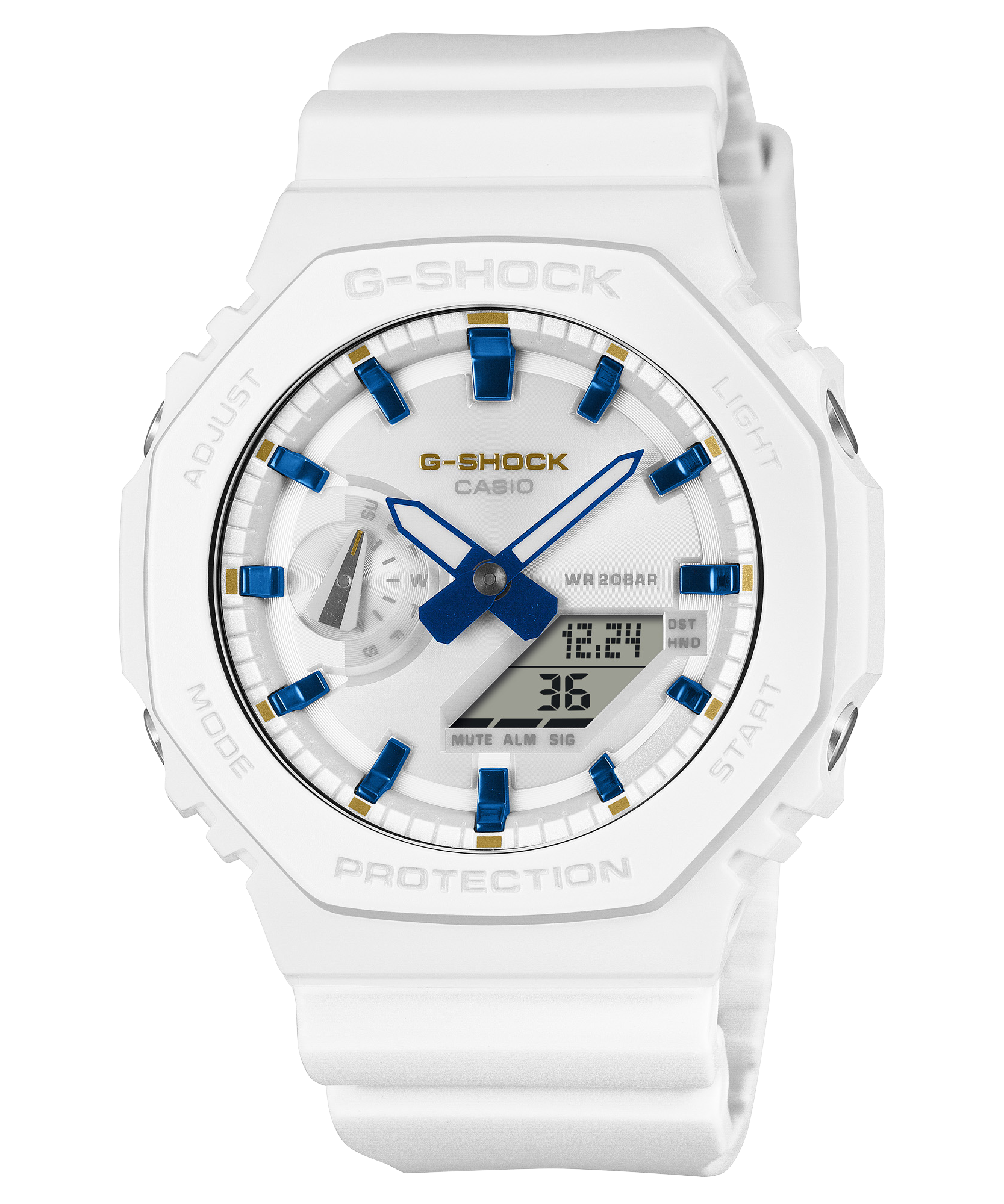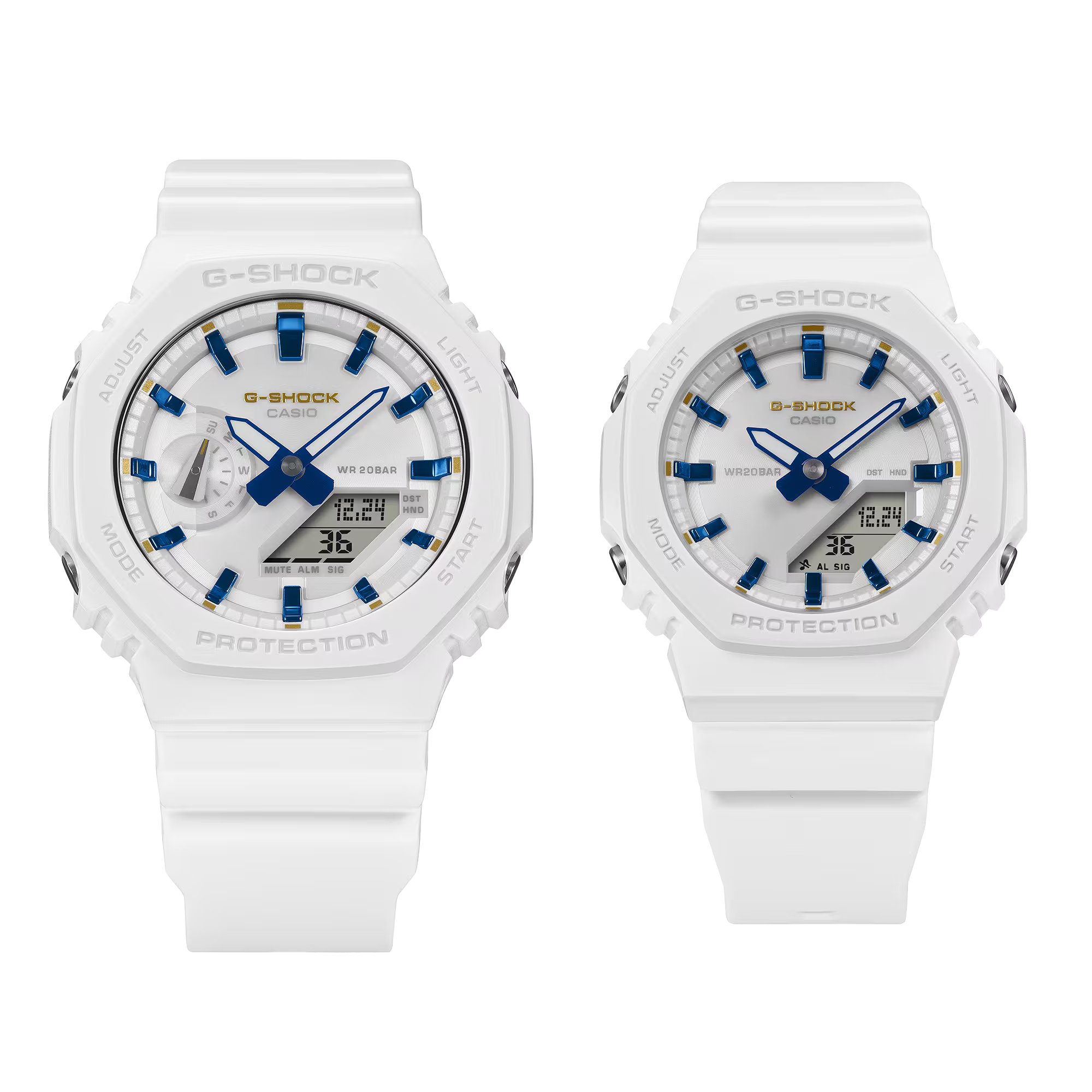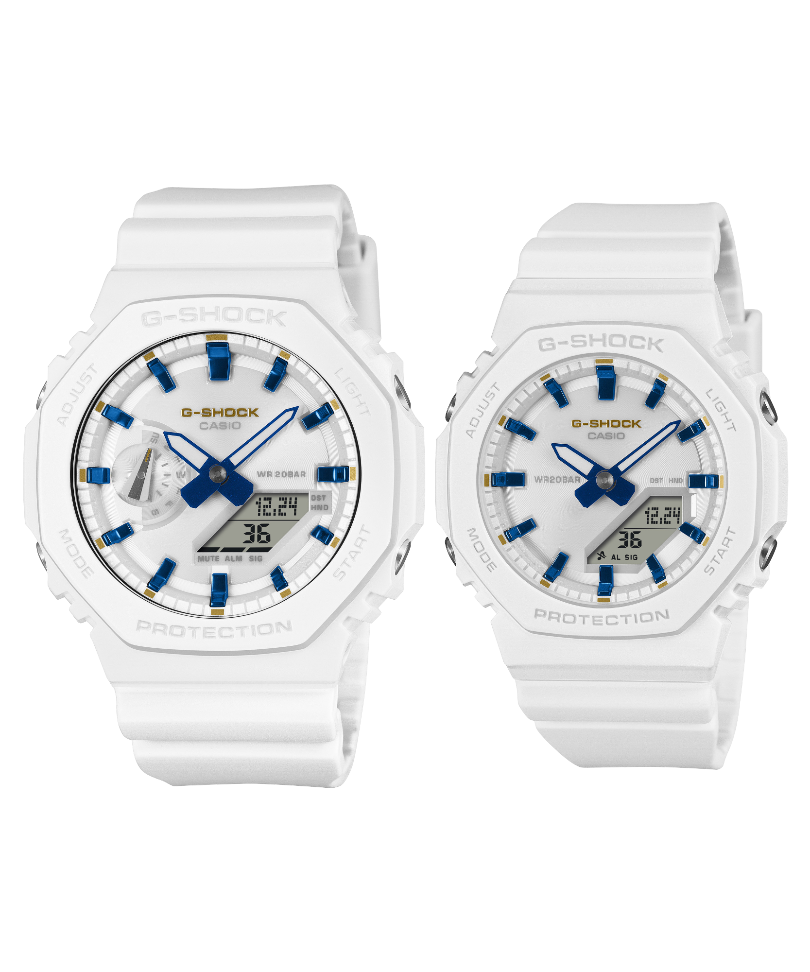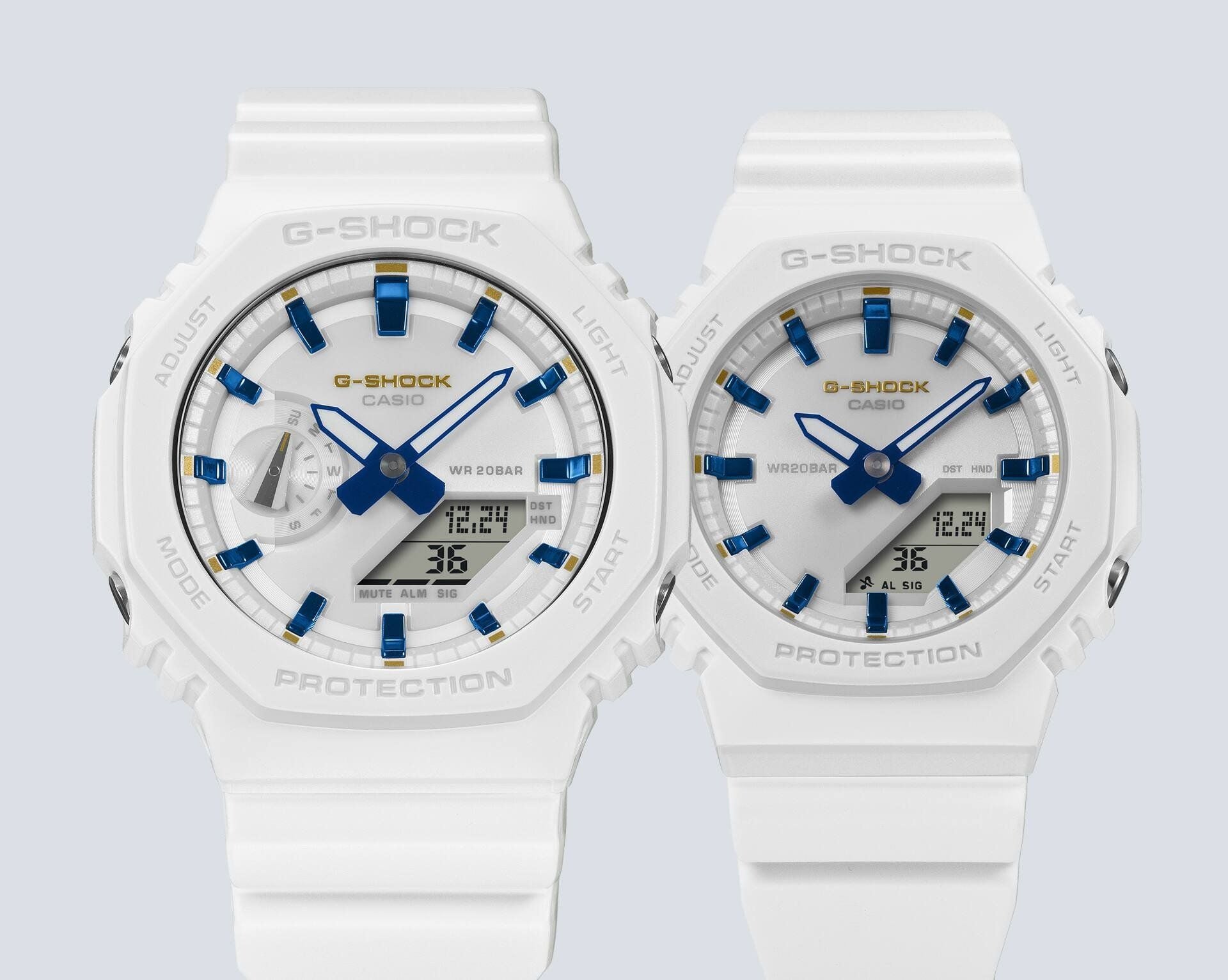 Hai mẫu đồng hồ GA-2100 và GMA-P2100 thời thượng, luôn được ưa chuộng với sắc trắng và xanh dương rực rỡ, lấy cảm hứng từ sự vui tươi của những vật trang trí lấp lánh. Với tông màu tươi mới và rực rỡ, những chiếc đồng hồ đôi này sẵn sàng chào đón mùa lễ hội hoặc tô điểm thêm cho phong cách của bạn bất kỳ thời điểm nào trong năm.