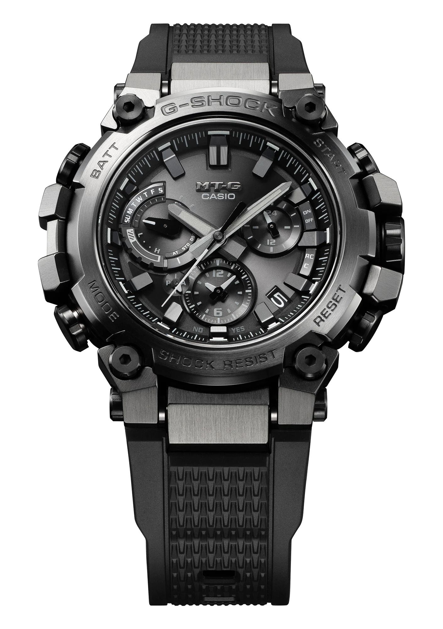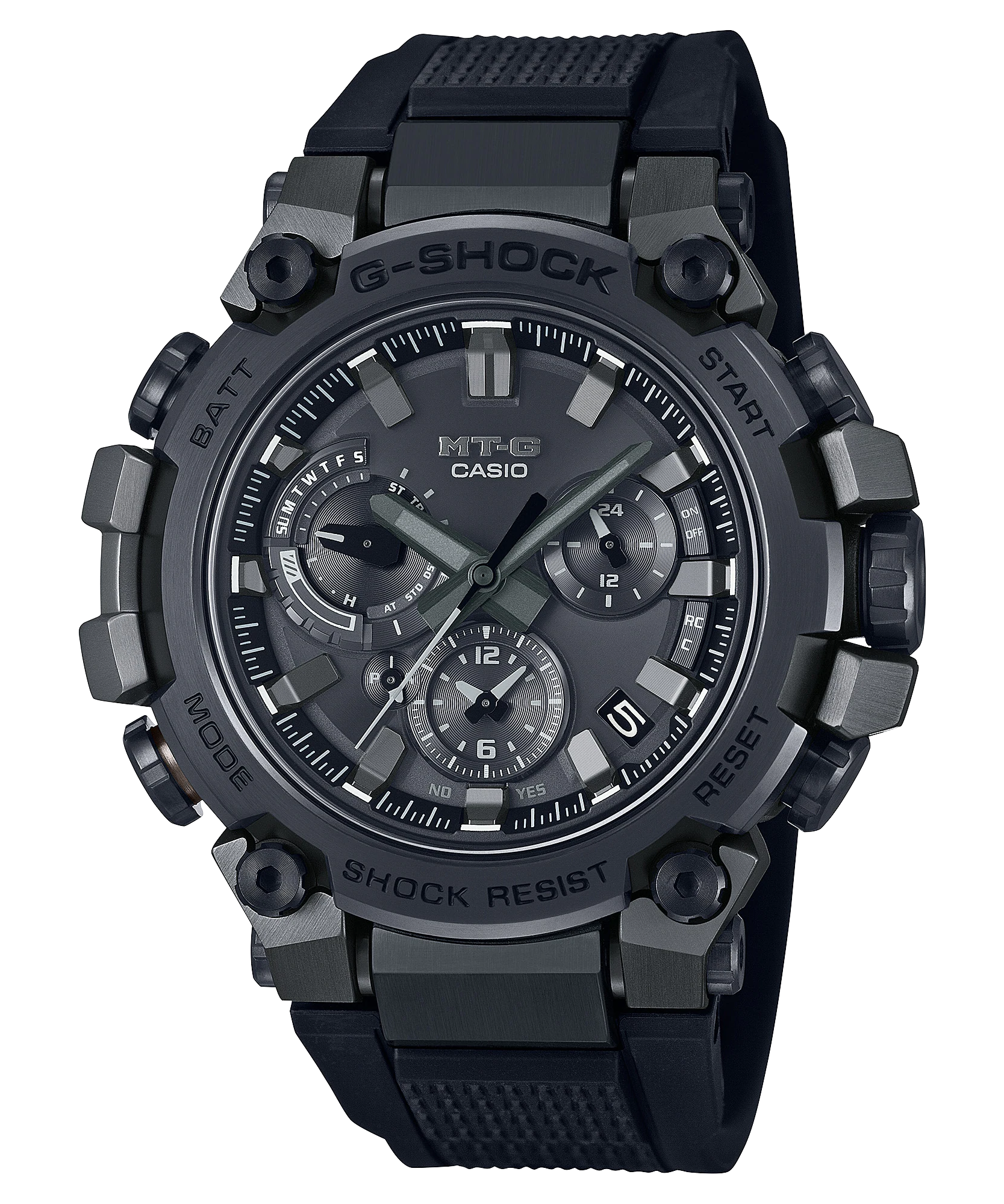 Khám phá vẻ đẹp kết cấu sáng tạo tuyệt vời với mẫu đồng hồ MT-G ra đời với ý tưởng thiết kế hoàn toàn mới, kết hợp nhựa được sử dụng cho những mẫu G-SHOCK đầu tiên với các chất liệu kim loại. Chào mừng bạn đến với phong cách thiết kế kết cấu tinh tế ở một tầm cao mới. Với cấu trúc bảo vệ lõi kép kim loại cao cấp hơn trước, mẫu đồng hồ MTG-B3000 bảo vệ mô-đun bên trong lớp vỏ nhựa gia cố sợi carbon và bọc phần bên ngoài bằng các thành phần kim loại. Thao tác ép, cắt và đánh bóng lặp đi lặp lại sẽ xây dựng mặt sau vỏ thép không gỉ trở thành một dạng 3D phức tạp. Mặt sau vỏ còn đóng vai trò như các vấu giúp cố định dây đeo và là đầu bảo vệ núm và nút, tạo nên một cấu trúc hoàn toàn mới. Sử dụng công nghệ gắn kết các chi tiết với mật độ cao, chúng tôi đã phát triển mô-đun đa năng mới và mỏng hơn. Tất cả những công nghệ và phong cách thiết kế sáng tạo này tạo nên mẫu đồng hồ mỏng hơn nhiều, với độ dày từ đường gờ đến phần vỏ sau chỉ có 12,1 mm. Sự sáng tạo của mẫu đồng hồ MT-G còn nằm ở phần dây đeo. Cấu trúc trao đổi một chạm hoàn toàn mới giúp bạn không cần sử dụng dụng cụ đặc biệt. Chỉ cần nhấn nút nằm ở hai bên phần vấu để hoán đổi dây đeo một cách nhanh chóng và dễ dàng. Tinh thể sapphire có độ trong suốt cao kết hợp với quá trình đúc và lắng đọng hơi tinh vi của công nghệ xử lý nano của Yamagata Casio tạo thêm điểm nhấn tinh xảo và chất lượng cuối cùng. Đồng hồ MTG-B3000B màu đen và xám đơn sắc có dây đeo bằng uretan mềm. Mẫu đồng hồ mang phong cách gai góc sáng tạo mới lạ này còn cung cấp nhiều chức năng thực tế. Tải ứng dụng CASIO WATCHES xuống để ghép nối với điện thoại thông minh của bạn qua Bluetooth®. Với Multi Band 6, hệ thống sạc Tough Solar và đèn LED có độ sáng cao, chiếc đồng hồ này giúp bạn duy trì hoạt động ở mức cao trong mọi chuyến phiêu lưu.